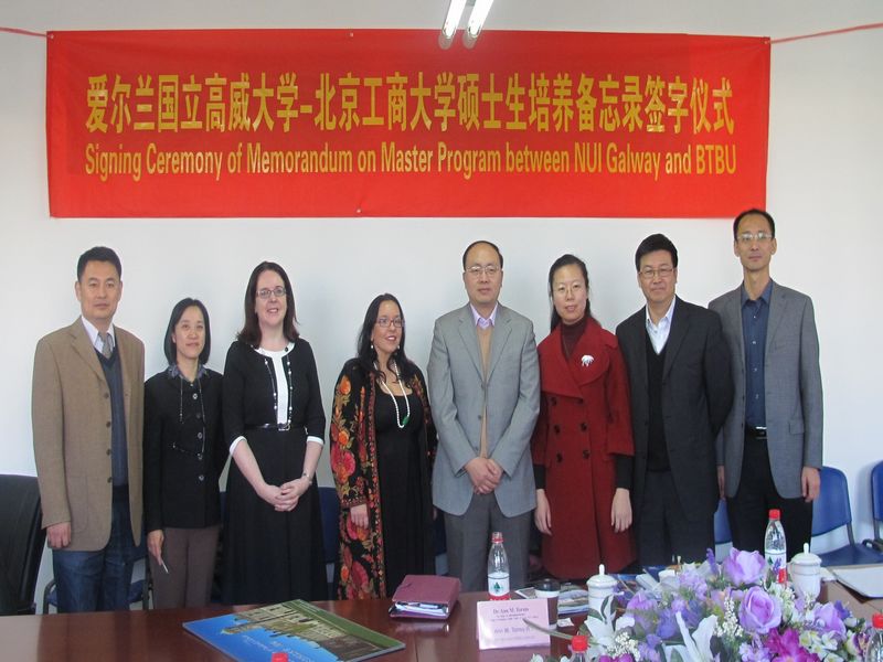 最后,材料与机械工程学院院长黄志刚教授、爱尔兰国立高威大学国际事务办公室主任Anna Cunningham女士代表双方共同签署了《北京工商大学材料与机械工程学院与爱尔兰国立高威大学学术交流备忘录》。