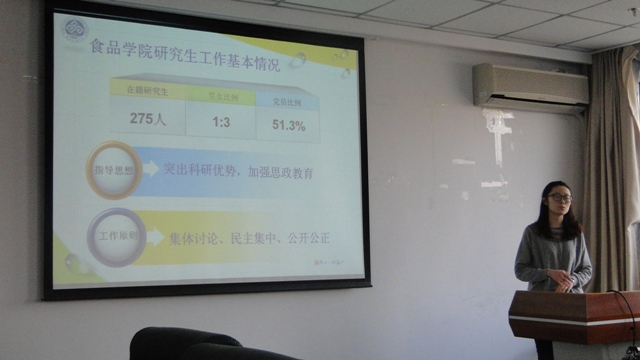 会上,各学院辅导员依次以ppt方式回顾了本学期的工作。食品学院以“突出科研优势,加强思政教育”为指导思想,通过分阶段、分层次、分专业工作模式,强化研究生的科学道德教育;结合学院专业特色,优化支部结构,创新性地把党支部建在学科专业点上,力求做到研究生党员培养全覆盖。材机学院坚持“搭桥梁、树形象、全覆盖、定方向”四步走,利用导师资源拓展学生成长教育的平台。计信学院积极寻求工作创新点,充分利用新媒体搭建就业资讯共享平台,在学院设立“就业墙”,及时跟踪反映每周各班签约动态情况,并对签约学生进行采访,分享求职优秀经验。经济学院则在管理规范化、服务精细化方面不断努力,力求各项工作让师生满意等。总体看来,各学院研究生辅导员能够适应新的岗位,态度认真、主动性突出,较好地完成了各项工作和任务,有的学院还结合学院特点开展了创新性工作。通过汇报,各学院对学期工作进行了梳理,加强了工作交流。