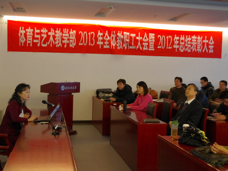 部主任顾红以大事记的形式回顾了体育与艺术教学部2012年的工作情况,即各位教师积极参与、群策群力,在本科教学综合改革、教学科研能力提升等方面取得可喜进步;创新工作方式,搭建有力平台,促进了学科融合;群体活动及运动会、艺术团建设迈上新台阶,各项大型活动取得圆满成功;艺术团首次走出国门,千人操震撼上演,元旦晚会异彩纷呈;分工会被评为“合格教职工之家”;游泳馆各项工作逐渐走向正轨,等等。她指出,以上成绩的取得,离不开全体教职员工的积极参与和共同努力。她对各位老师表示衷心的感谢,并希望在新的一年里,全体教职员工再接再厉,共同为部门和学校的发展做出贡献。顾红还对2013年的工作重点做了部署和通报。