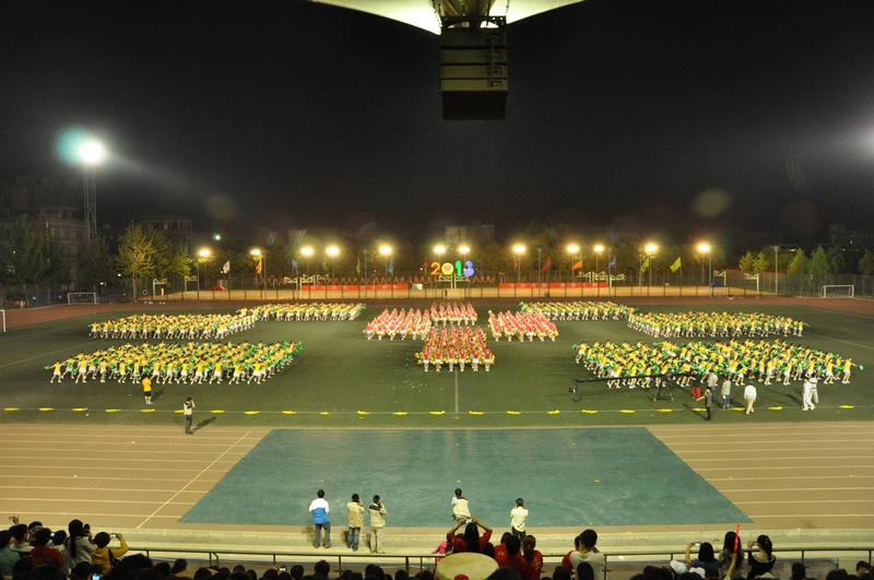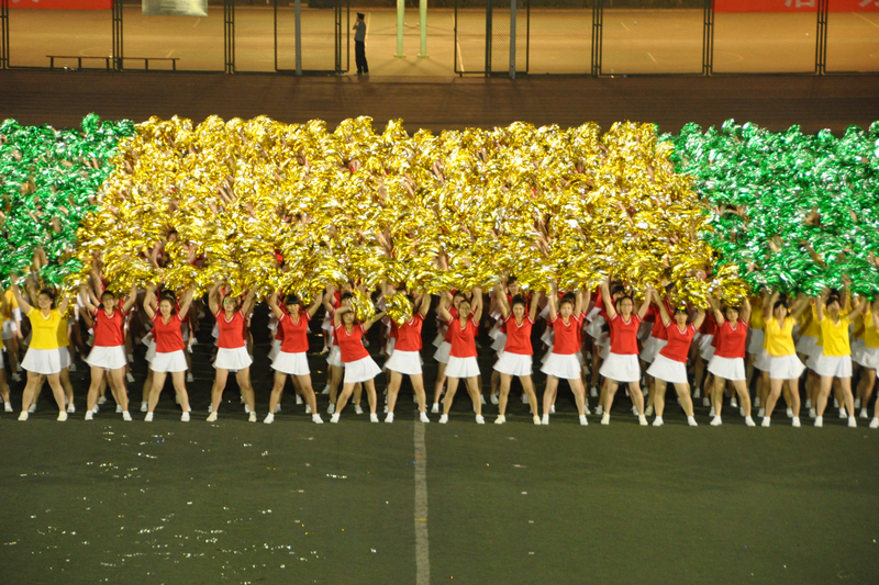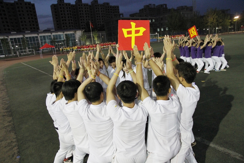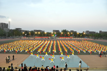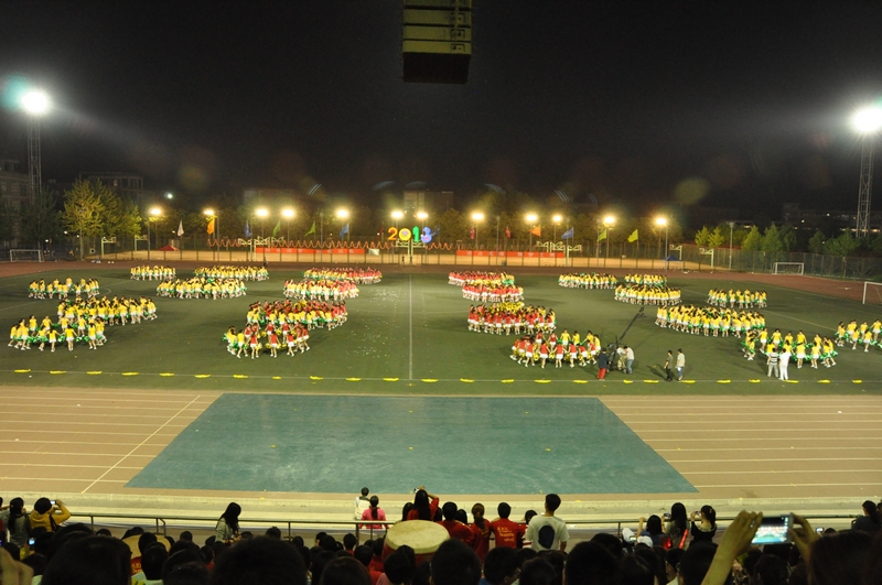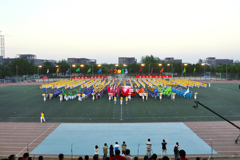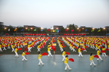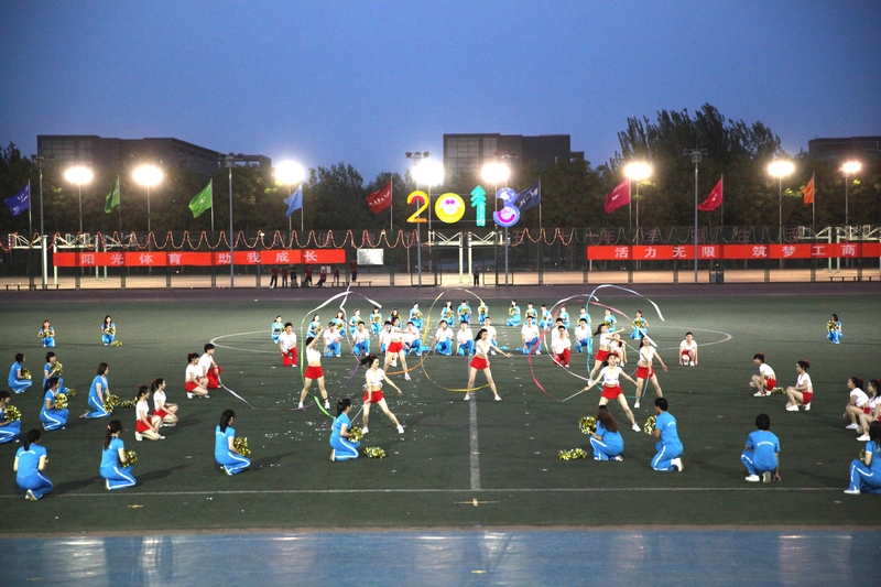 青春的节奏,让朝气蓬勃的大学生伴随着乐声在运动场上绽放出最美的年华。来自商学院、经济学院、艺术与传媒学院、计信学院以及材机学院的1008名大一女生踏着欢快的啦啦操歌曲惊现“舞台”。她们身着红色和黄色制服,高举手花,用各式各样的队形淋漓尽致地展现着“巾帼不让须眉”的气魄。长久的期盼在此刻化作了自信的笑容洋溢在每一位同学的脸上,她们用年轻人的青春蓬勃绘出了一幅又一幅壮美的画卷:“小飞机”、“2013”、“花团锦簇”不断地展现在观众的视野中。指导教师王立红说,团体操的训练让同学们都参与到了体育锻炼中,看到大家这样辛苦训练的成果在此刻展现,我们真正做到了为自己加油。