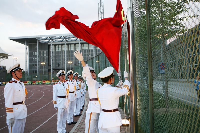 矫健的身姿,铿锵的步伐,雄壮的国歌声中五星红旗徐徐升起,开幕式正式拉开帷幕。