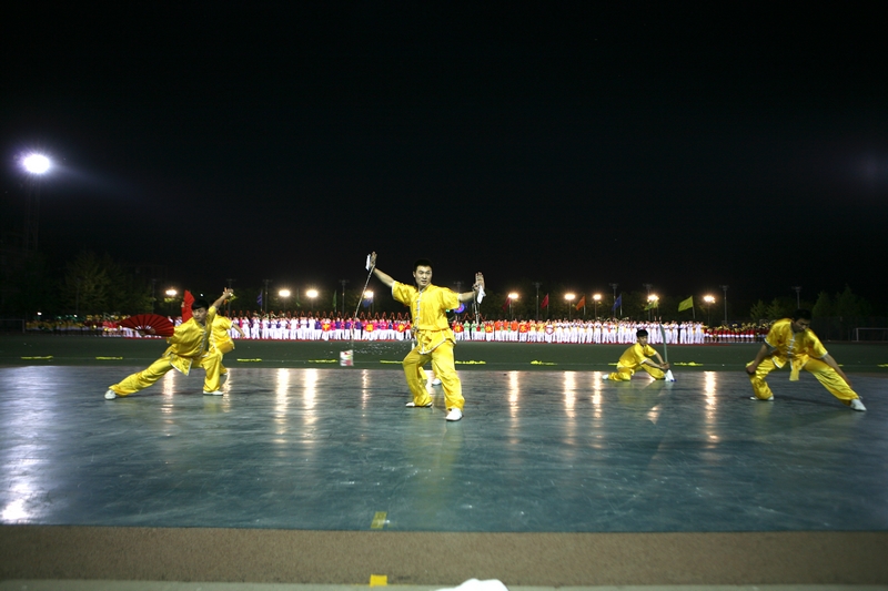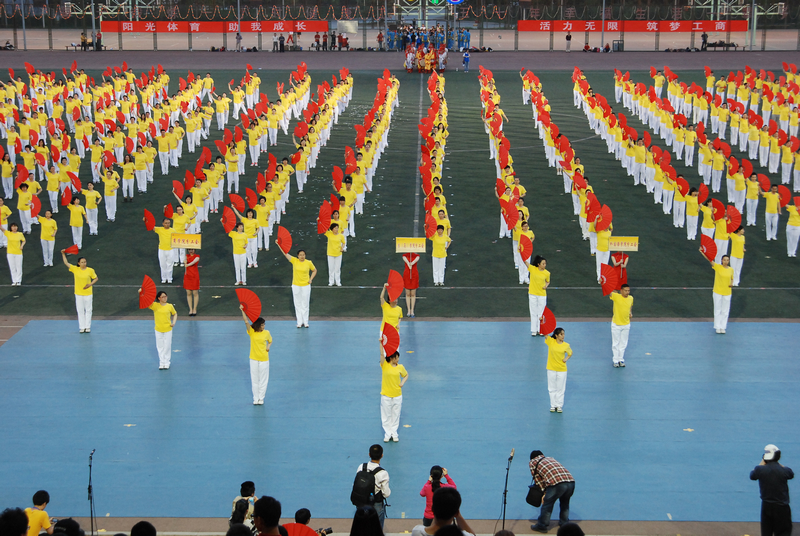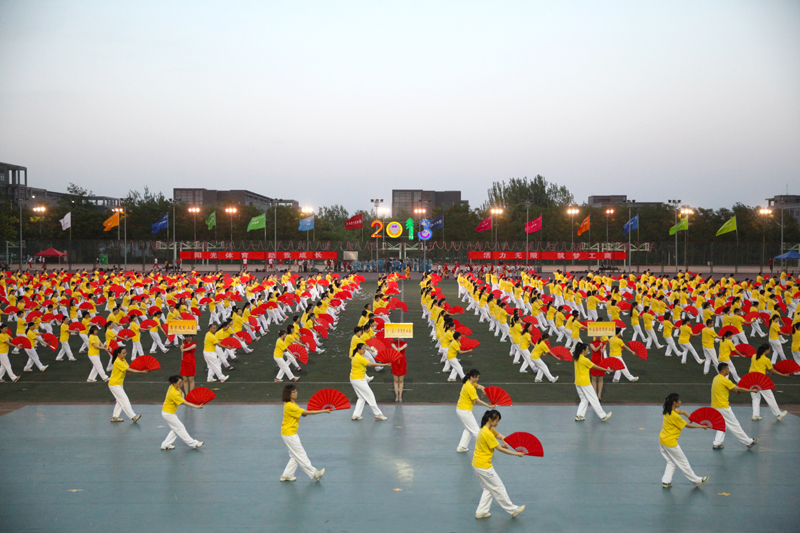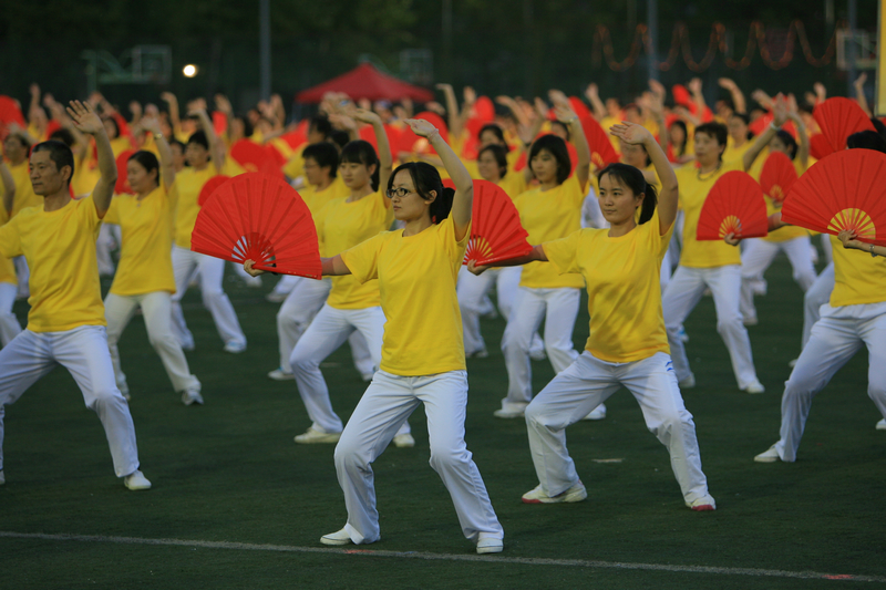 首先上场的是教职工带来的《中国功夫》太极扇表演。三尺讲台上的老师们今天也踏上了运动场,来自学校14个分工会的近700名教职工身着黄色上衣、白色运动裤,手持红色舞扇,豪情万丈,一招一势尽展功夫气魄。太极扇表演在刚柔之间展现 “快乐健康,幸福生活”的理念,近三个月来,各分工会认真组织,积极练习,老师们逐渐体会到了太极扇的韵味和乐趣。整齐的动作、飒爽的英姿展示了北工商教职工别样的风采,鲜红的折扇挥舞出壮丽的美景,精彩的表演激起了现场阵阵的掌声。