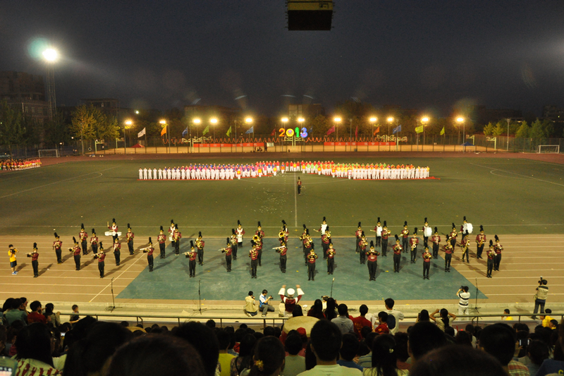 奏乐声起,校管乐团的行进管乐表演响彻全场。管乐团的同学们身着亮丽的制服,在快速队形变换同时进行音乐演奏。表演的四首作品由四支摇滚乐队的成名歌曲改编而来,并在一次次的队形变换当中展现了校徽和象征着建校日期的1950等图案,表演充满动感和视听冲击力。