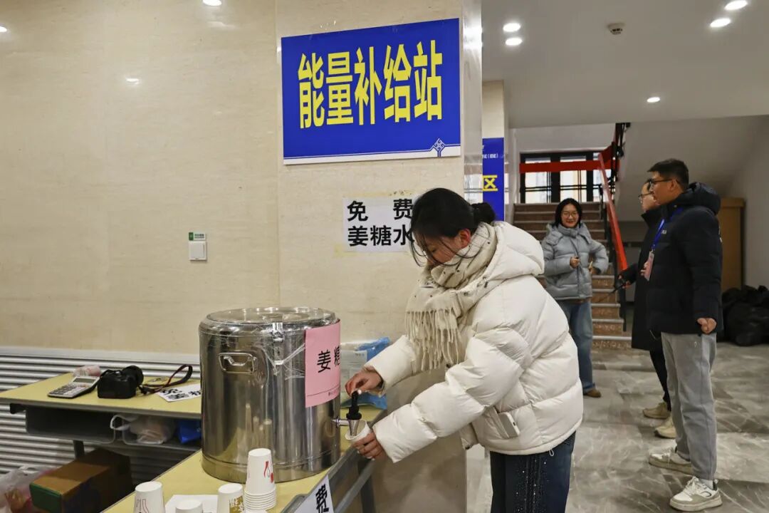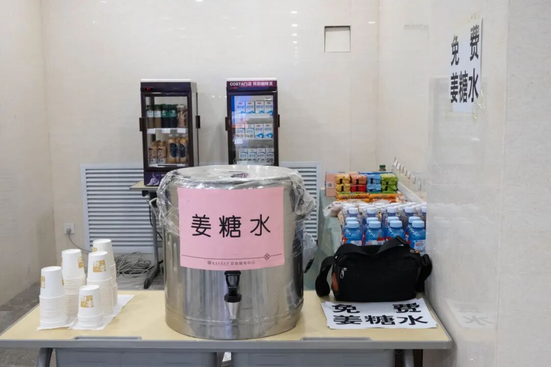 “来杯姜糖水暖暖身子!”西区食堂一楼和教一楼的开水、红糖姜茶随时供应,氤氲热气驱散了冬日寒意;教一楼候考区的临时销售点,早餐、小食、饮品一应俱全,方便考生及时补充能量。