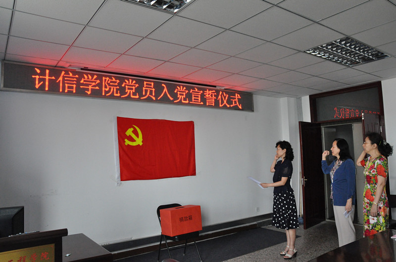 同日,蔡强院长主持举行入党宣誓仪式。今年六月计信学院共有3名教师预备党员转正,学院部分教工党员参加了他们的入党宣誓仪式。老党员与新党员一起宣誓,重温入党誓词,共同回忆党走过的92载峥嵘岁月。熟悉的誓词引发了教师们的思考。薛红教授作为新党员代表发言,她说:“成为了一名党员真的很开心,今后将更加积极地工作,虽然年纪大了,但仍然会以一个新党员的身份严格要求自己,努力向大家学习。”老党员张晓力老师表示:“我们在重温誓词时会问自己,有没有真正地履行党员义务,有没有真正做到积极工作,这促使我们反思与进步。” 入党积极分子青年教师祝晓斌表示:“今天的宣誓仪式很神圣,今后一定要向老党员学习,积极上进,努力工作。” 党总支书记陈谊对三位新党员表示了祝贺,然后勉励在场的全体党员和积极分子:要继续发扬党的优良传统,在学院的各项工作中发挥模范带头作用,发挥正能量,为学院的发展做贡献。