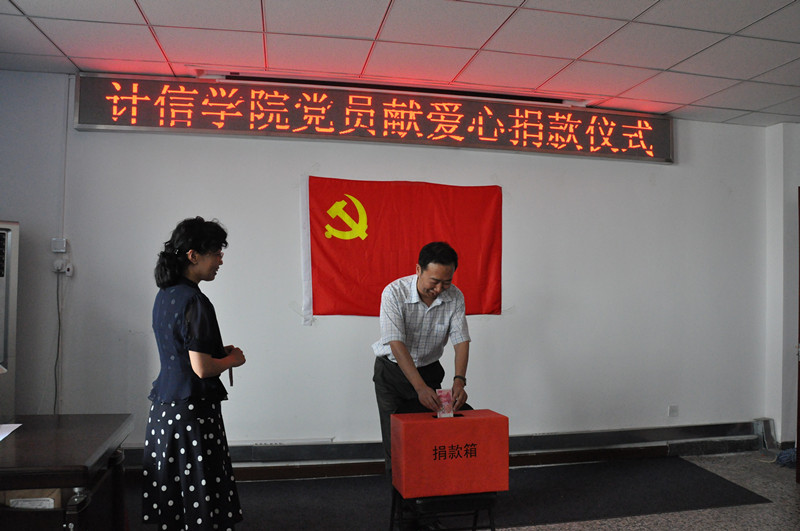 此外,计信学院积极响应“共产党员献爱心”捐献活动,举行了“党员献爱心”捐款,院领导班子成员带头,教工党员积极响应,进行了现场捐款。“党旗凝聚力量,信念铸就梦想”,计信学院党总支将继续用实际行动践行北京精神,展现党员风采。