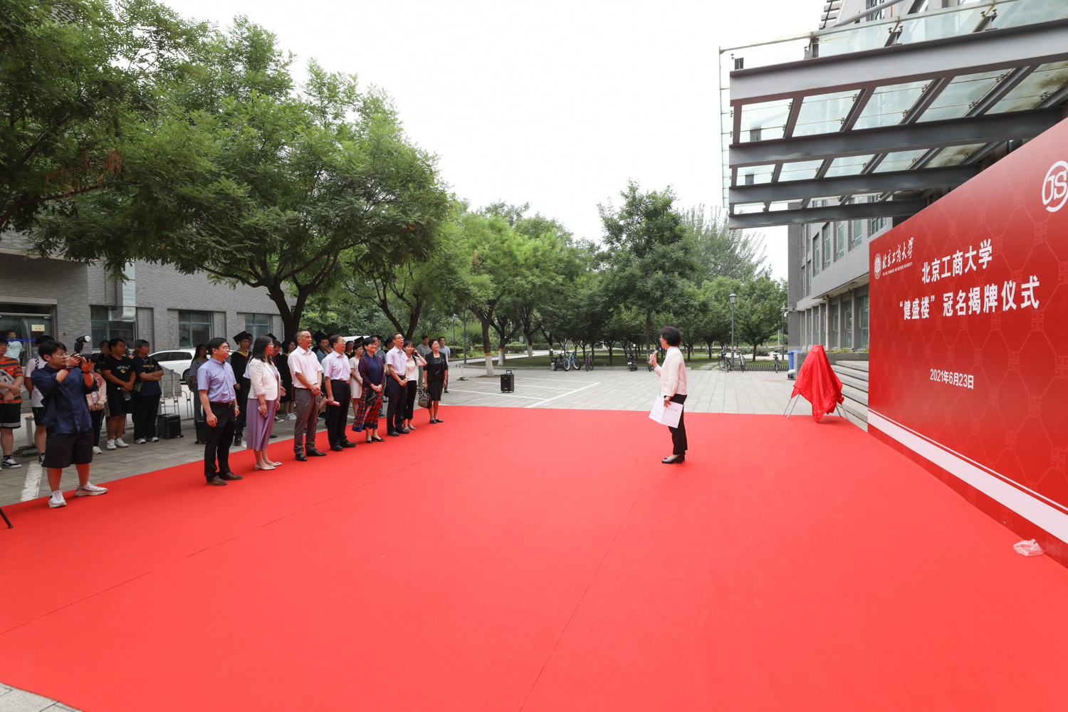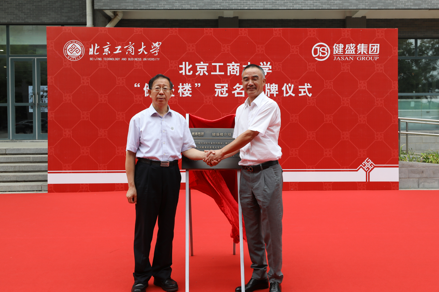 6月23日下午,北京工商大学“健盛楼”冠名揭牌仪式在良乡主校区隆重举行,党委副书记、校长孙宝国院士,浙江健盛集团股份有限公司董事长张茂义、集团副总裁郭向红出席仪式。仪式由我校副校长、教育基金会理事长张耘主持。