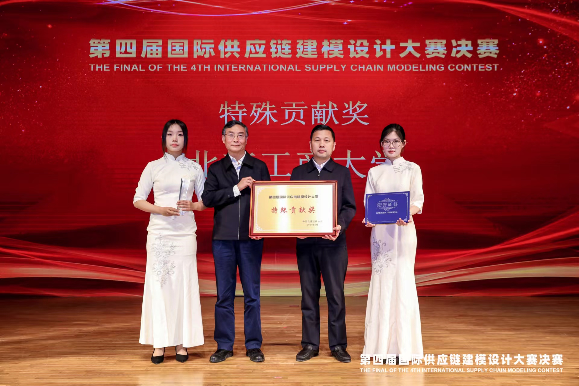 在颁奖仪式后,李刚代表主办单位进行总结发言,对大赛的成功举办表示祝贺,对所有参与大赛的选手、评审专家和工作人员表示衷心的感谢,并为北京工商大学颁发了“特殊贡献奖”,以表彰学校为承办本次大赛做出的贡献。至此,第四届国际供应链建模设计大赛在北京工商大学圆满落幕。