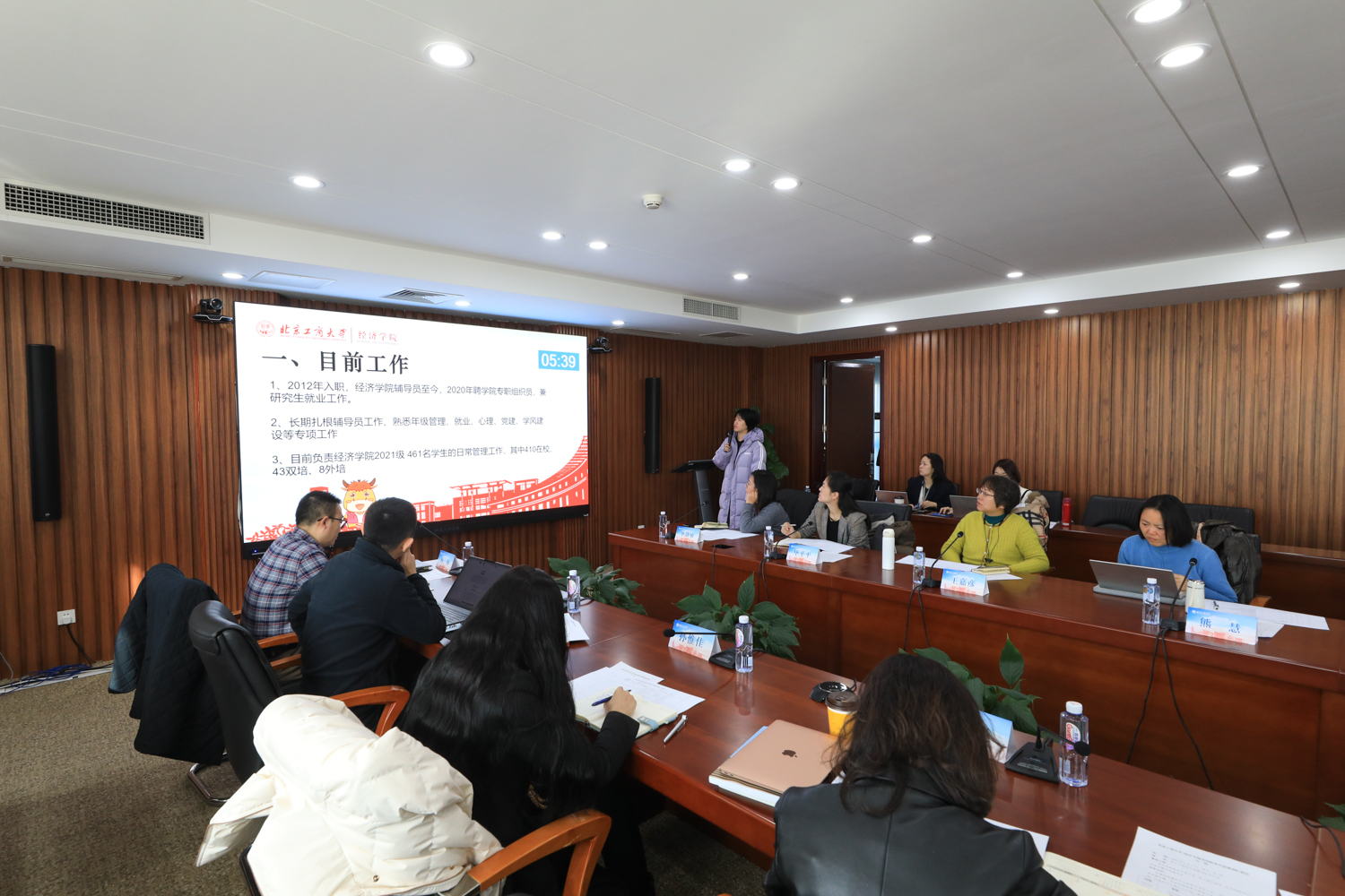 与会领导对辅导员队伍情况开展讨论,研究提出相应问题的解决方案和提升措施。李中奇作总结讲话,他指出,辅导员是做好大学生思想政治教育工作的骨干力量,辅导员队伍建设是学校2024年十大重点任务和未来四年的学生工作要点,应高度重视、持续推进应用型、研究型、创新型、职业化、专业化、专家化“三型三化”辅导员队伍建设。首先,应引导辅导员构建高质量的工作目标、研究型的工作思维,推动思想政治教育工作发展。其次,要通过个体奋斗、立体保证、整体提升“三体发展”路径,促进队伍工作能力、科研能力、创新能力的全面进步。最后,学工部门、各学院应调动各方面积极性,创造各尽其能的生态环境,为辅导员搭建好个人成长的载体与平台,打造北工商特色的辅导员队伍文化与价值体系。