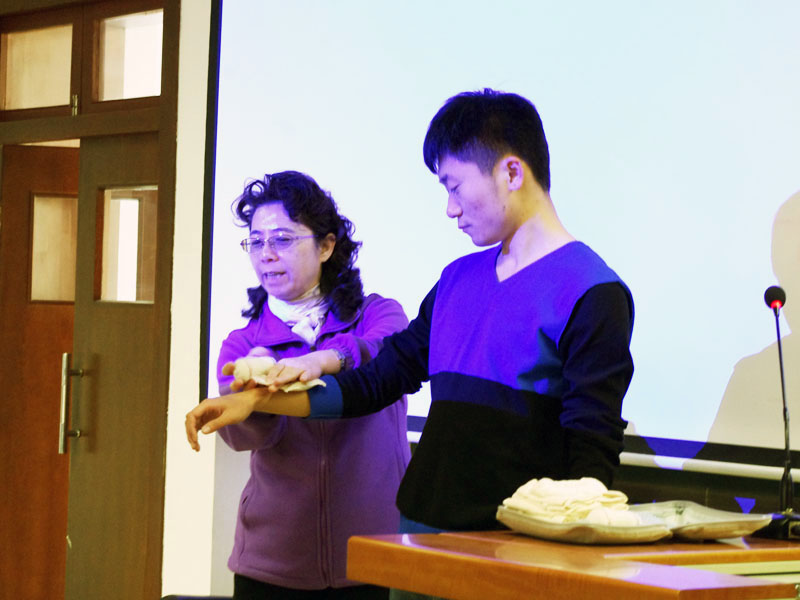 杨沙娜老师结合救护新概念、突发事件,现场紧急救护的基本理论,展示了心肺复苏、外伤止血、包扎、固定、搬运等救护技术,详细讲解了学生们日常生活中容易出现的失火、烫伤、骨折等事件的紧急处理方法。杨老师的讲解深入浅出,条理清晰,指导性强。参训的学生表示,通过培训了解了日常生活中突发事件的紧急处理方法,增强了自救互救意识与能力。