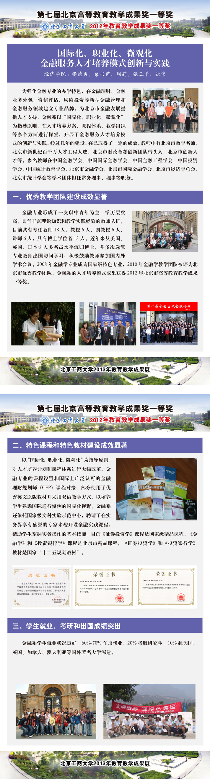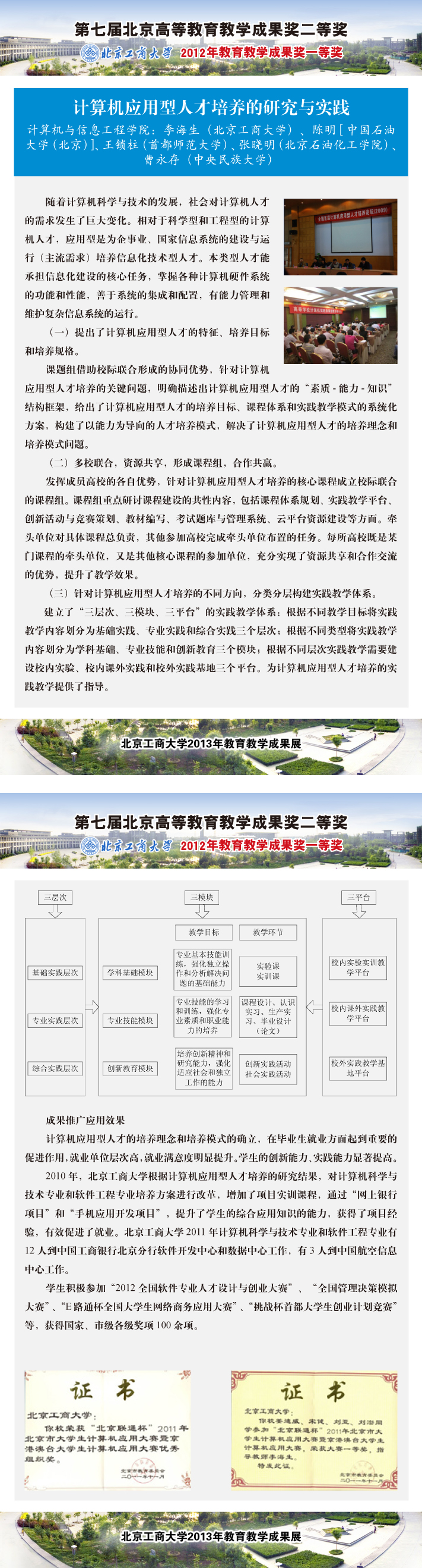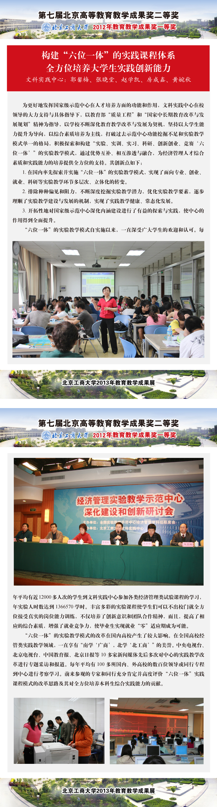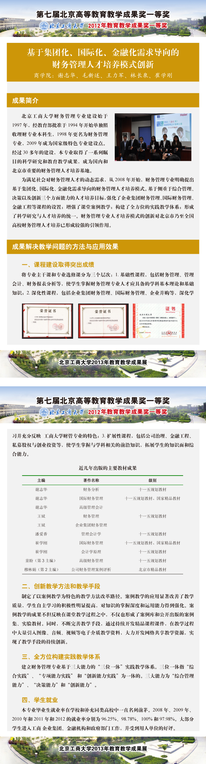 日前,《北京市教育委员会、北京市人力资源和社会保障局、北京市财政局关于表彰北京市教育教学成果奖的决定》(京教人〔2013〕18号)发布。在第七届北京市高等教育教学成果奖评选活动中,我校共有5项成果荣获一等奖、9项成果荣获二等奖。根据北京市教委有关文件精神,为了更好地展示和宣传我校教育教学和人才培养成果,总结本科教育教学经验,营造良好的教学工作氛围,学校举办2013年教育教学成果展,现进行网上展示。