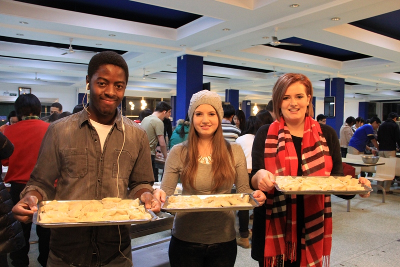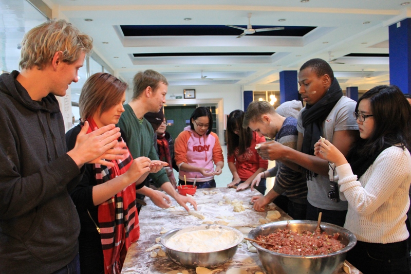 12月10日,国际处组织留学生与国际交流与合作协会的志愿者在东区食堂开展了“中国传统文化之冬至包饺子活动”。中外学生早早地来到食堂,一看到摆放整齐的擀面杖、面团、饺子馅就迫不及待地行动起来。对于从未包过饺子的外国留学生来说,包饺子是一项比较困难的技术活。在志愿者的耐心帮助下,每一个留学生都学会了擀皮,包出了自己满意的饺子。经过将近1个半小时的努力,大家一同品尝了亲手包的热气腾腾的饺子。留学生们纷纷表示,这是他们吃过最好吃的饺子。