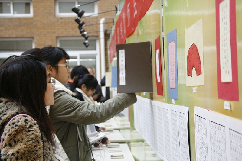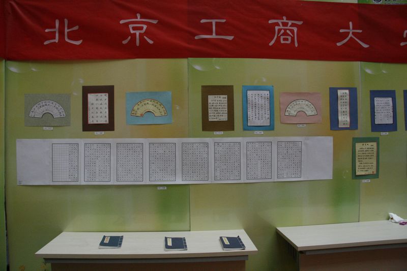 前来观看展览的同学们认真地观看了展出的魏晓寰老师授课的我校及北方工业大学大学学生书法及篆刻作品,并和魏晓寰老师进行了交流。展览上还展出了部分魏晓寰老师书法及篆刻作品。展览将分别在阜成路校区和良乡图书馆进行。