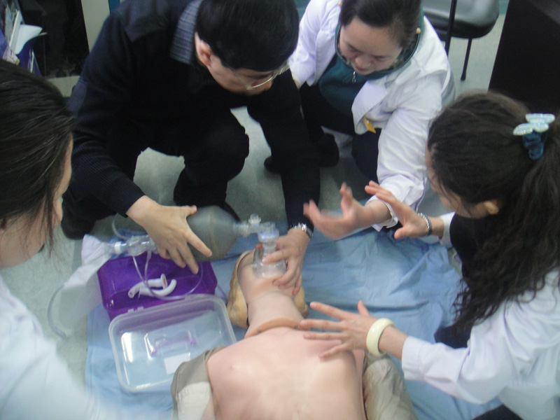 王立秋主任结合实际病例讲述了急诊急救的重要性、必要性和操作方法,通过播放视频与现场示范,重点讲述了心肺复苏技术(2010版指南)、气道管理的方法。结合高校实际情况,王主任有针对性地讲解了常见外伤的止血、包扎等实用知识。蔡冶副院长及参训医生就校医院现有急救设备的充分利用与王主任进行了交流。
