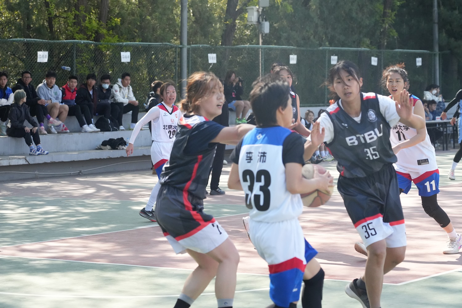 赛事一开局就进入胶着状态,在僵持中,我方35号殷路得率先出手打板命中,为北工商打进第一球!随后北工商势如破竹,第一节以12比10领先2分结束。第二节伊始,35号殷路得、10号李彤持续突破篮下,将比分差距迅速扩大至21比15,领先6分。半场回来,对方不断调整战术,持续突破篮下挑篮得分,追平得分后反超我校2分。在焦灼比赛中,我方首发7号李泽苇在争抢篮板球时崴脚受伤,我校教练立刻叫了暂停,稳定队员情绪,重新布置战术,用13号王靖淳替换上场,并接连拿下关键篮板球。在比赛关键时刻,我队14号张思颖接连送出两记利落的盖帽,并与进攻中接到23号后卫马思佳半场传导球后突破篮下,造成对方犯规,两罚中一,北工商姑娘们士气大涨,尤其在35号殷路得进攻只剩5秒时关键三分命中,激起所有队员高亢的情绪,吹响了进攻的号角。姑娘们越战越勇,接连得分,一路高歌猛进,场上节奏完全被我队掌控,最终以7分的优势夺得冠军!