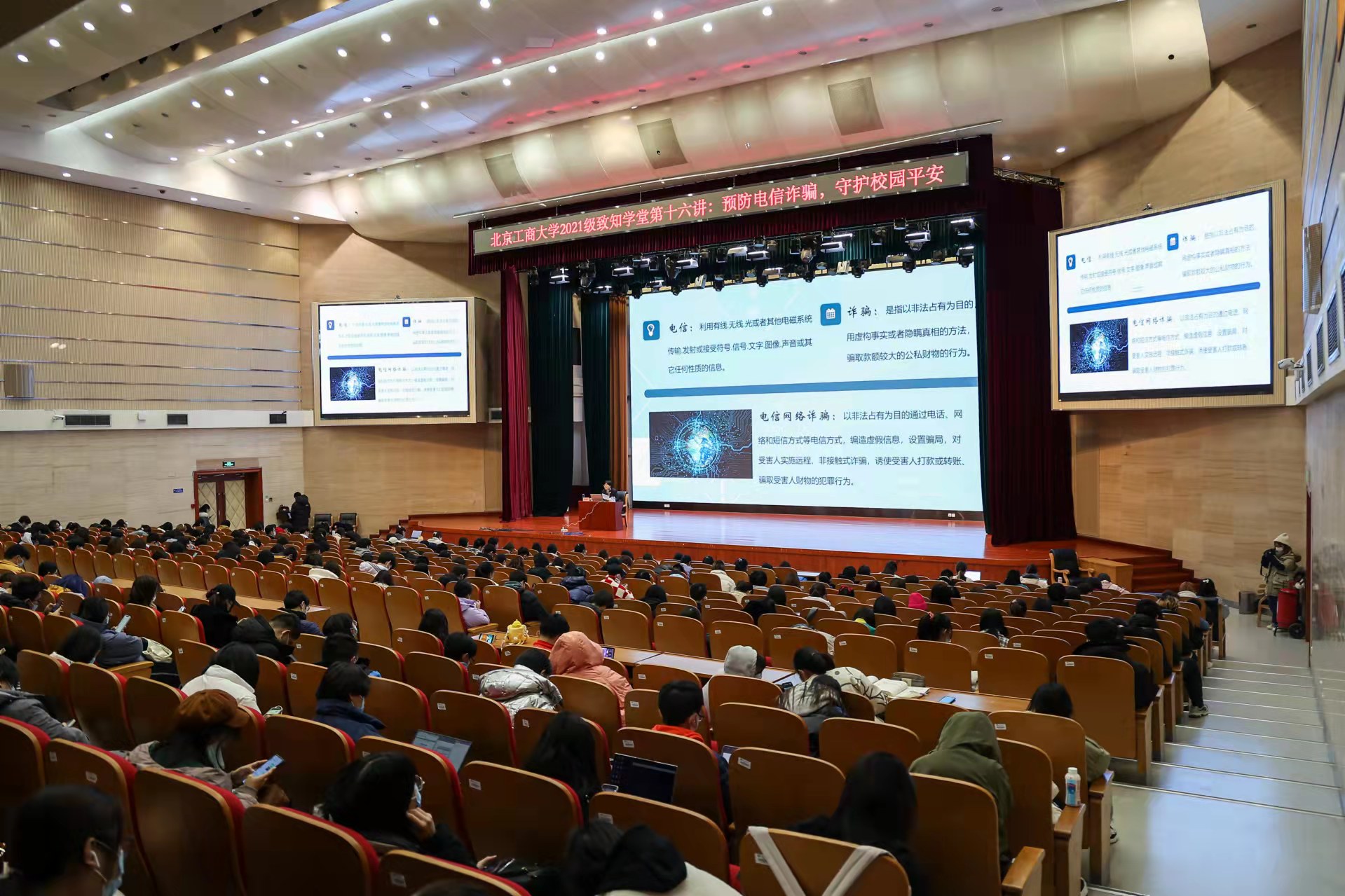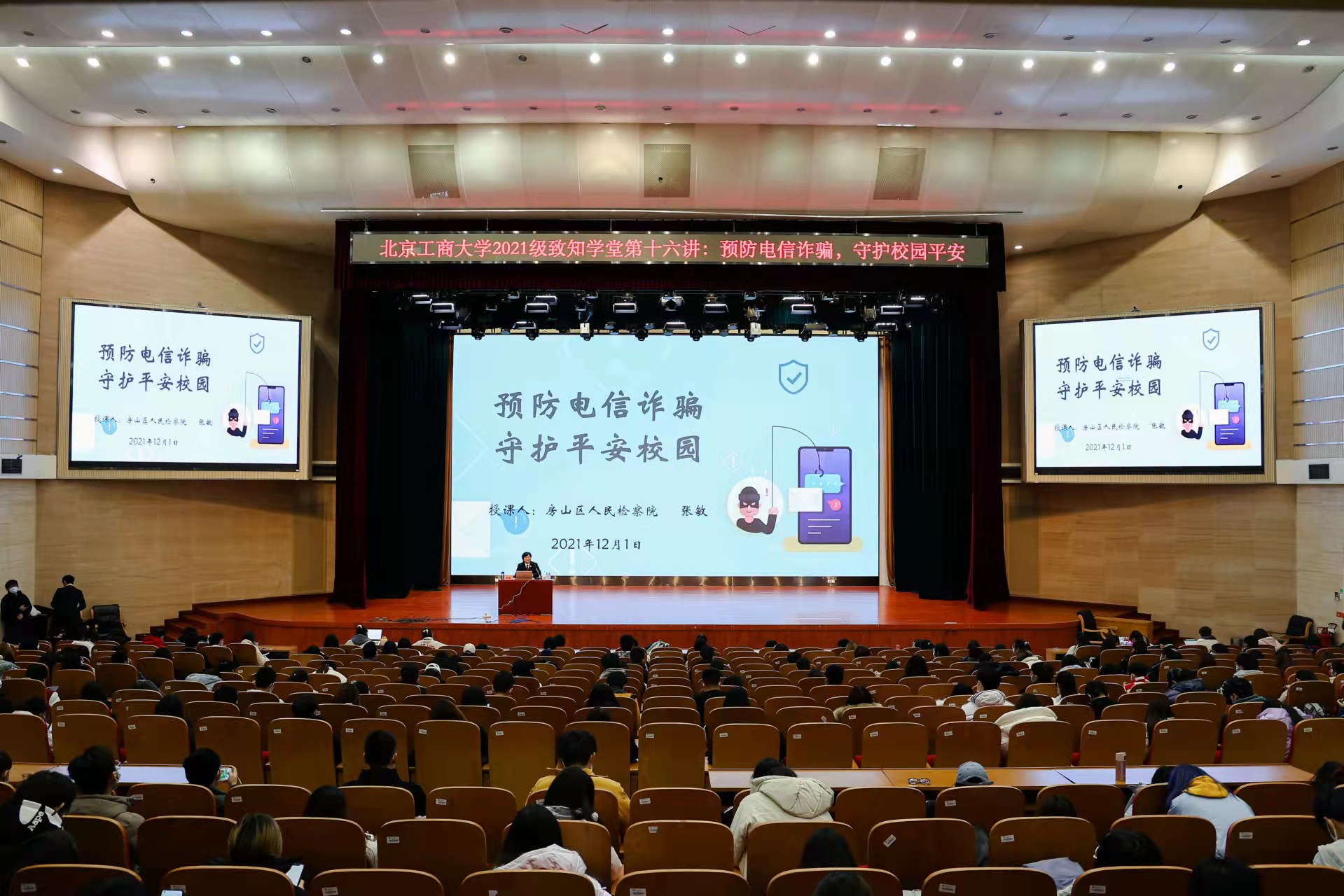 12月1日,北京市房山区人民检察院第一检察部主任、四级高级检察官张敏,以“预防电信诈骗 守护平安校园”为主题为同学们带来致知学堂第十六讲专题讲座。张敏结合了身边相关案例详细讲解了“网络刷单”“杀猪盘”“注销校园贷”等几种电信诈骗形式,向同学们介绍了电信诈骗的定义及特点,揭示了电信诈骗的常见类型、诈骗手段、作案方式等,最后向同学们讲解如何预防电信诈骗,避免成为其“帮凶”。