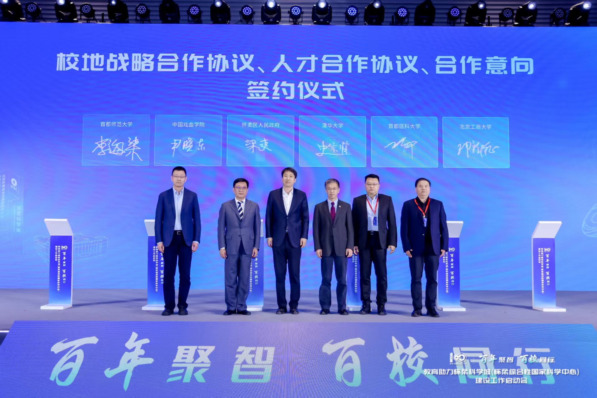 4月28日,“百年聚智 百校同行”教育助力怀柔科学城(怀柔综合性国家科学中心)建设工作启动会举行。学校党委常委、副校长邓祥征出席活动并代表学校与怀柔区政府签署校地战略协议、人才合作协议。签约仪式在怀柔区金隅兴发科技园举行,北京市委常委、教育工委书记于英杰,市政协副主席、怀柔区委书记、怀柔科学城党工委书记郭延红,市委教育工委分管日常工作的副书记李军锋,市委教育工委副书记、市教委主任李奕,怀柔区委副书记、区长、怀柔科学城党工委副书记、科学城管委会主任梁爽等出席。