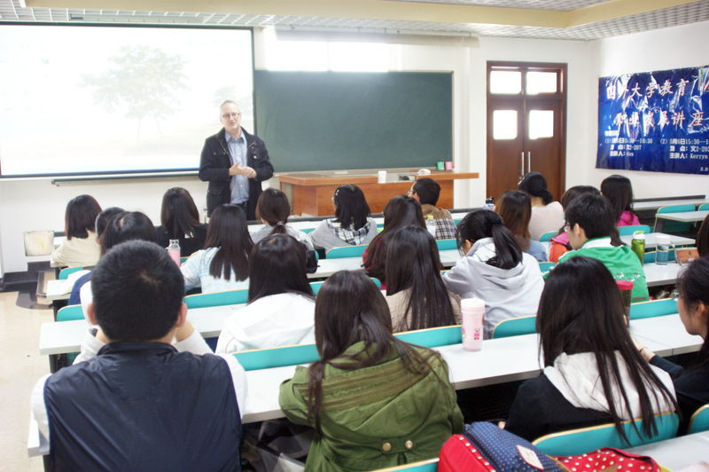 Alex Thrower曾在英国中学担任校长,具有丰富的教学经验。他从中外大学教育的异同入手,向同学们系统地介绍英国大学的培养模式和教育发展趋势,解答大家关于出国留学、就业等方面的问题。他讲,作为一名大学生,应学会独立思考,并对个人学业和职业发展进行规划,确定适合自己的发展方向。他特别指出,在全球化人才发展的背景下,世界各国大学生都将面临更加严峻的就业压力,并希望同学们能够树立正确的择的意识和就业观念。