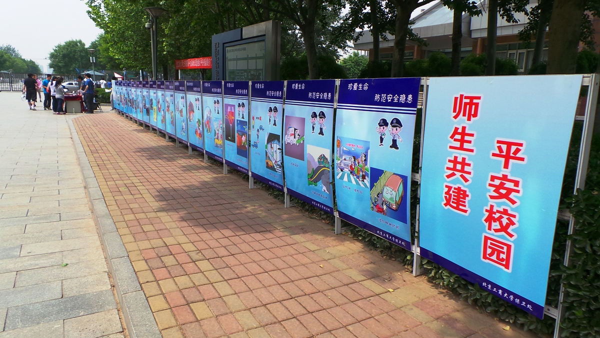 保卫处还在钟楼两侧甬路上摆放了关于“防火、防诈骗、防交通事故”的宣传展板,号召师生进一步提高安全防范能力,共同推进平安校园建设。