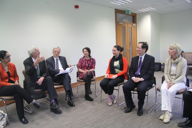 在爱尔兰考克大学,谭校长会见了该校校长迈克尔·墨菲(Michael Murphy)教授、常务副校长保罗·吉乐尔(Paul Giller)教授,双方回顾了两校的合作历程。谭校长向墨菲校长介绍了两校合作办学本科项目之一“应用统计学(风险和精算)(国际)”的招生和教学准备情况,以及2014年申报的两校合作办学本科项目“食品科学与工程(国际)”的进展情况。墨菲校长表示考克大学已经做好准备,期待首批两校中外合作办学项目学生来考克大学学习,同时希望能进一步拓展与我校的合作领域。考克大学艺术、凯尔特研究及社会科学学院院长卡洛琳·芬内尔(Caroline Fennell)教授、科学、工程与食品科学学院代院长保罗·麦克斯韦雷(Paul McSweeney)教授、食品与营养科学学院院长于尔约·鲁斯(Yrjo H. Roos)教授、阿兰·凯利(Alan Kelly)教授及西姆斯·马霍尼(Seamus A O Mahony)博士、数学科学学院黄健博士、经济学院迪克兰·乔丹(Declan Jordan)博士、国际教育办公室中国战略工作组主席斯维尔·里德尔莫(Sverre Lidholm)博士等依次介绍了有关项目合作情况。谭校长一行还与我校派出留学的两位研究生进行了座谈,了解他们的学习和生活情况,并勉励他们好好学习,今后报效祖国。