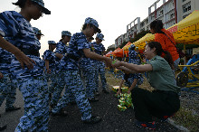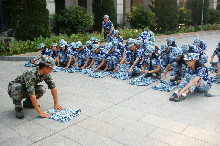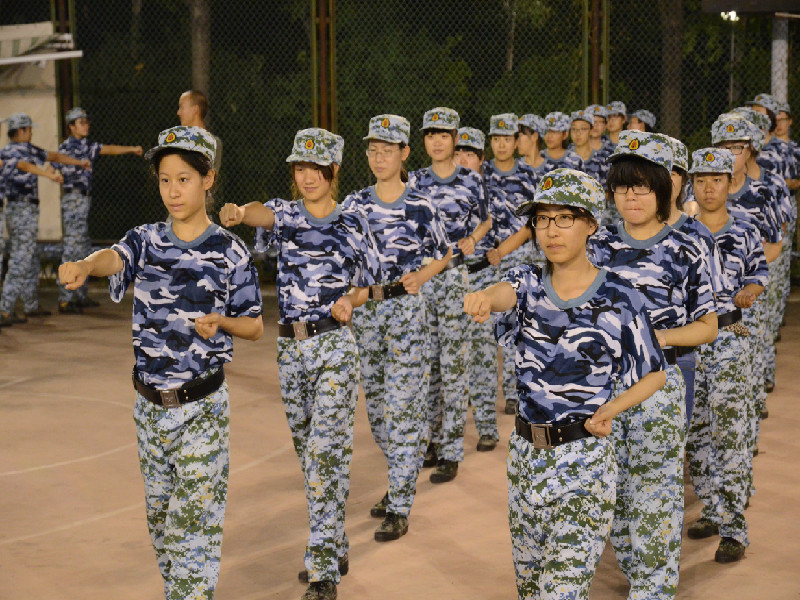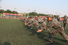 站军姿是军训的第一个项目,也永远是最辛苦的项目。迷彩与绿地浑然一体,目之所及,学员们像远处默然不语的电线杆般肃然而立,即使湿透的汗衫让他们感到不舒服,但却仍坚持着,保持着每一个姿势。“两脚跟靠拢并齐,两脚尖向外分开60度;两腿挺直;小腹微收,自然挺胸;上体正直,微向前倾;头要正,颈要直,口要闭,两眼目视正前方”,教官略带沙哑的嗓音感动了站在场边的记者。