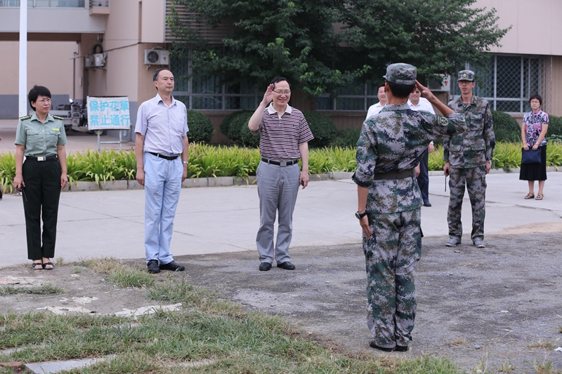 谭向勇书记首先到军训现场视察。在各训练点,2014级学生们响亮的口号、整齐的步伐、有序的物品摆放,昂扬的精神面貌,都得到了谭向勇书记的肯定。他对工作在军训一线的带队辅导员们以及各方面保障人员表示慰问,对部队6天来的辛苦施训表示感谢,并要求军训团做好统筹协调工作,在老生返校开始上课后,尽可能减少与新生军训的相互干扰。