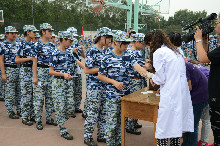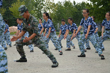闷热的雨天并没有让同学们的毅力与热情褪减。站队、稍息、立正,一系列动作熟练而有气势,整齐的步伐、响亮的口号和饱满的精神得到了教官的表扬。一营一连一班的教官说道:“我对同学们的表现非常满意,他们每一点进步都让我感到十分欣慰,希望他们这种良好的态度能一直持续,并将这种态度融入到日后的学习与生活中,从而成为一名拥有军人精神的大学生。”常年辛苦而晒黑的脸,严肃而有力的命令,这是你看到的教官,却不是他们的全部。训练时他们一丝不苟,将军人严明的纪律教给学生,休息时拉歌聊天,又让学生们看到朴实面貌下乐观积极的心。