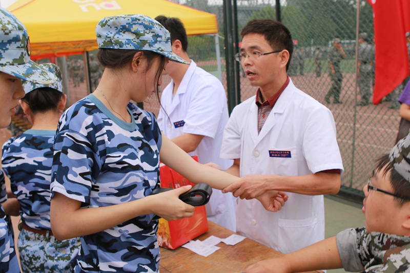 享受到军训指挥部细致入微、贴心服务的远远不止这14名同学。“前几日,有一位同学突发状况,学校军训保障车第一时间送到医院,学生看病全过程一直都有指导员、老师们陪同。” 郭建荣老师向记者详细讲述了因胆结石住院的新生情况。在学生工作第一线的辅导员们积极投入到军训工作中,连指导员均由各学院辅导员老师担任,他们不仅负责学生们的思想政治教育工作,更是全程参与军训、全程关注班级每一位学生的训练、生活情况。“除了正常的军训工作以外,每年其实最担心的是孩子们的身体状况,怕他们中暑,怕有意外情况的发生......”已经连续第七年带新生军训的经济学院辅导员向小平老师跟记者谈到,“好在今年军训计划安排的合理,突发状况少了很多,我们的担心也少了很多。”向老师随身携带的一个小包引起记者的注意,向老师解释道:“这里面都是一些藿香正气、风油精、创可贴,还有一些巧克力,我们都随身带着,以防万一学生有突发状况可以应急。” 而第一次作为带班辅导员的计信学院的党浩老师对于军训则有不一样的感受和体会:“第一次带学生军训,既兴奋又紧张,当听到‘计信是冠军’的时候,感觉作为这个集体的一份子特别自豪,紧张则是因为没有带班经验......”党浩老师谦虚的笑笑,但据记者了解到,虽是第一次带班,但为了更好的开展工作,暑期,得知云南受灾之后,党浩老师第一时间联系到了今年入学的计信学院所有云南籍新生,及时对学生进行了慰问并了解灾区新生的情况,同时,对于年龄较小的96年后的未成年学生,他也特别与家长取得了联系,提前对学生的情况了解熟悉。在与向老师和党老师的交谈中,记者感受到的更多的是感动,这份感动不仅来自于老师对学生无微不至的关怀,也来自学生对老师的触动,正如党浩老师所说:“孩子们在军训中表现出的坚毅与执着特别触动我,很多同学受伤、晕倒都不愿意离开训练场,这令我很感动,同时也让我觉得很荣幸成为他们的老师。”