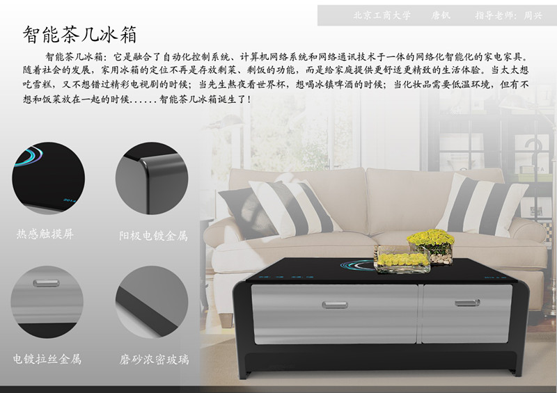 大赛设“数字化制造与设计创新”、“智能产品与服务设计创新”及“社会创新”三大组别。唐钒在指导教师周兴的指导下,以设计项目“智能茶几冰箱”参加了“智能产品与服务设计创新”组别的竞赛。该设计把家电和家居相结合,回归到用户需求的原点,同时融入物联网的设计理念,符合智能家居家电这一未来的家居家电发展的大方向,牢牢把握消费趋势,将关注重点放在洞察用户需求并以创新功能来满足用户需求,给追求精致生活的人们以更好的生活体验。最终该项目在来自海内外近400多份的设计作品中脱颖而出并获得了银奖。