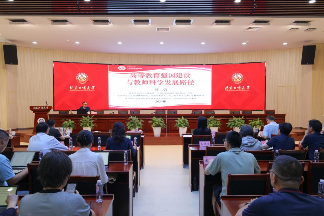 6月11日,“工商大讲堂”第七讲暨“教育家精神”专题培训在良乡主校区开讲。北京师范大学京师特聘教授、博士生导师薛二勇应邀作题为“高等教育强国建设与教师发展科学路径”的专题讲座。校领导宋晓欣、毛新述、邓祥征、刘艳楠与各二级单位党组织书记、各学院院长及教师代表线下聆听讲座,各学院组织教师通过分会场线上观看,实现两校区多地联动学习。讲座由学校党委副书记宋晓欣主持。