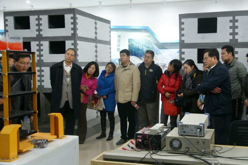 在齐福荣书记的全程陪同下,考察团参观了校史馆、火山科学园地、地震模拟振动台和灾害模拟实验室和工程地质实验场。在参观展示火山内容的科学园地时,地质学专家蒋靖祥研究员介绍了采自我国四大火山群的火山岩标本、火山活动与板块构造的关系。在地震模拟振动台、灾害模拟实验室和地下结构与工程地质实验场,防灾工程专家郭迅教授演示了砂土液化、滑坡、泥石流等与地震灾害相关的各类实验,讲述了地震对于不同形态建筑的影响及目前有效的隔震技术和避震手段。