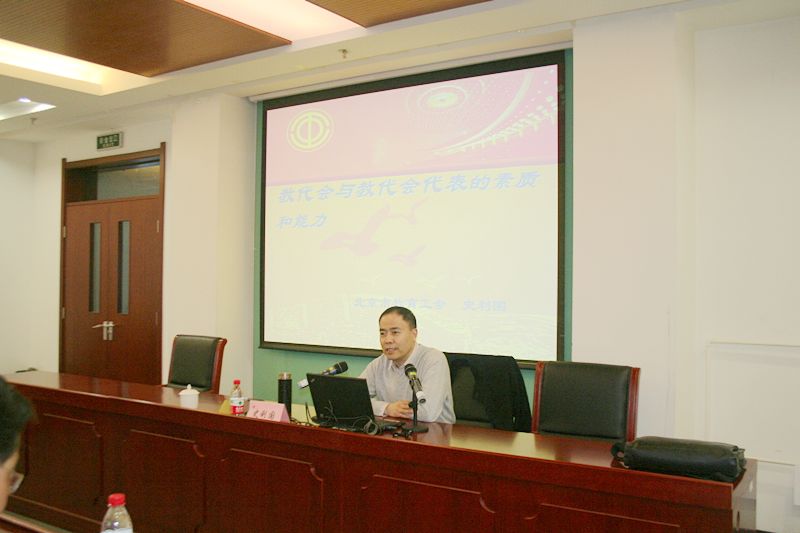 史利国主席结合当前国家的政策和高校面临的形势和任务,以《教代会和教代会代表的素质和能力》为主题,从教职工代表大会是学校民主管理的基本形式、教代会与教代会代表的职权、教代会代表的素质和能力等三个方面进行了讲解,阐述了教代会的重要意义,结合《学校教职工代表大会规定》(教育部32号令),系统讲解了教代会的八大职权,提出了教代会代表应具备的三大素质。他还对北京市委教工委、市教委、市教育工会讨论的《关于加强新形势下学校教职工代表大会的工作意见》进行了详细解读,从教代会的民主建设、基本原则、各项权利、自身建设以及程序、组织保障等六个方面分析对比了新旧文件的变化。他强调,教代会作为高校民主建设的重要形式,其地位和作用显著提高,学校工会要承担起教代会工作机构的职责,其责任越来越重大。