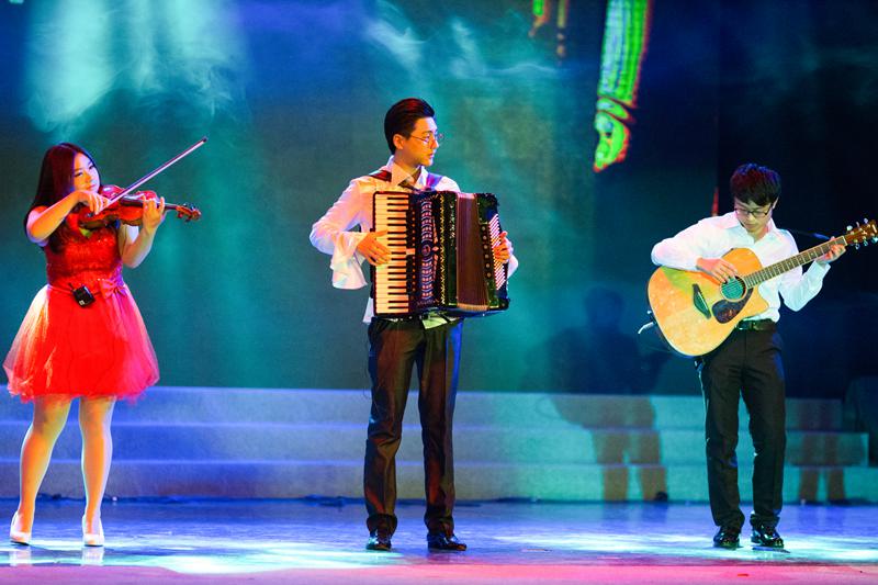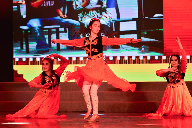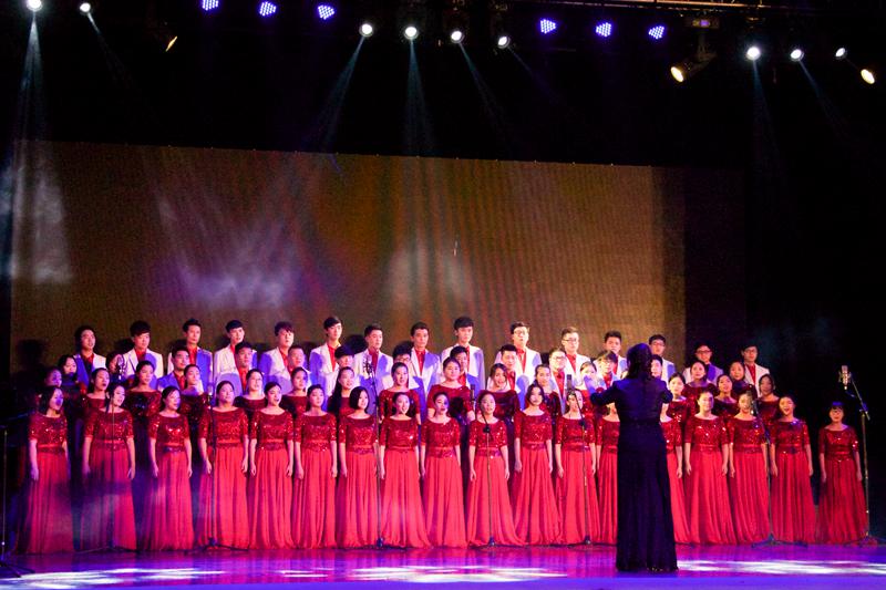 校合唱团为观众带来了大合唱《时间都去哪儿了》,宛转悠扬的歌声勾起人们对时光的回忆与珍惜。歌者红衣似火,浅唱欢快的旋律,一首《walk together children》以载歌载舞的形式点燃全场的气氛。