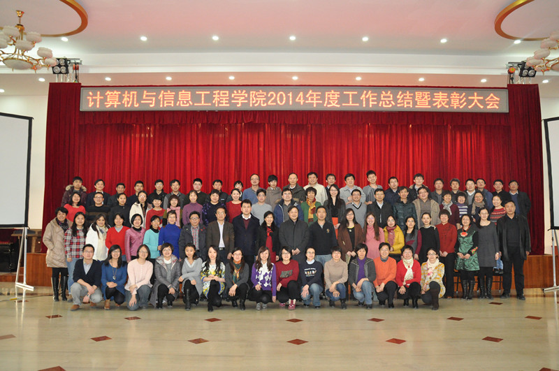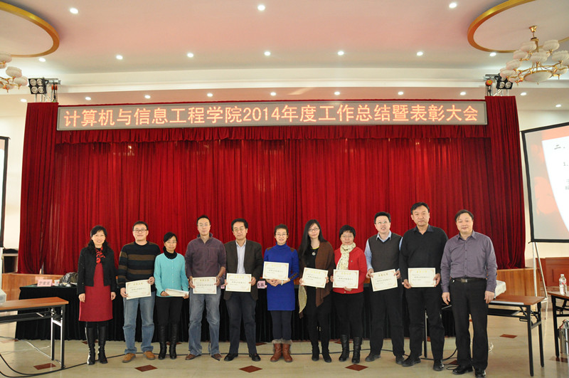 党总支书记陈谊宣读了《计算机与信息工程学院关于表彰2014年度先进个人和集体的决定》,表彰了教学工作先进个人、科研工作先进个人、学科竞赛优秀指导教师、党务工作先进个人、宣传工作先进个人、优秀班主任、优秀辅导员、学生就业贡献奖、教学基本功比赛优秀奖、分工会活动积极分子十大奖项共113人。获奖个人和代表上台接受了荣誉证书,在大家的掌声中合影留念。