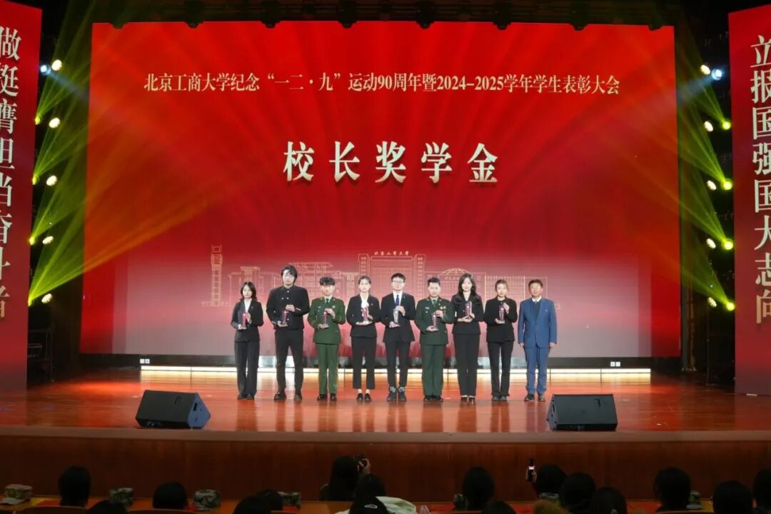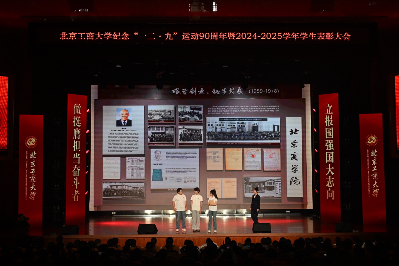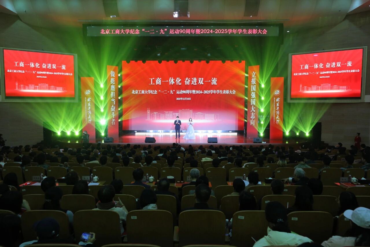 12月10日,北京工商大学纪念“一二·九”运动90周年暨2024-2025学年优秀学生表彰大会在良乡主校区举行。校领导沈千帆、郭建华、李中奇、宋晓欣、杨红、徐丹丹、邓祥征出席大会,相关职能部门负责人、各学院党政领导、校友奖学金代表、校友代表、教师代表、获奖学生代表参加大会。大会荣幸邀请到了当年曾参与和组织“一二·九”运动的黄华、陆平两位革命先辈的后代:黄玫女士与陆莹女士,与全场师生一起见证传承历史伟绩,表彰青春榜样,激昂奋斗力量。