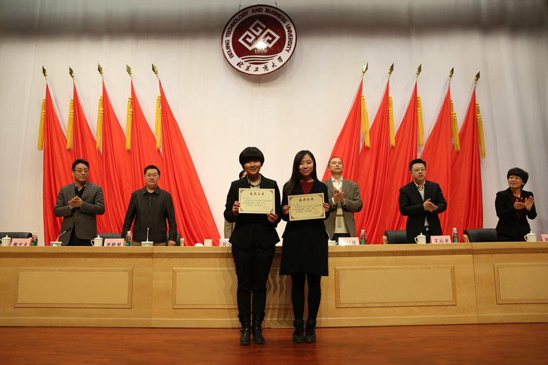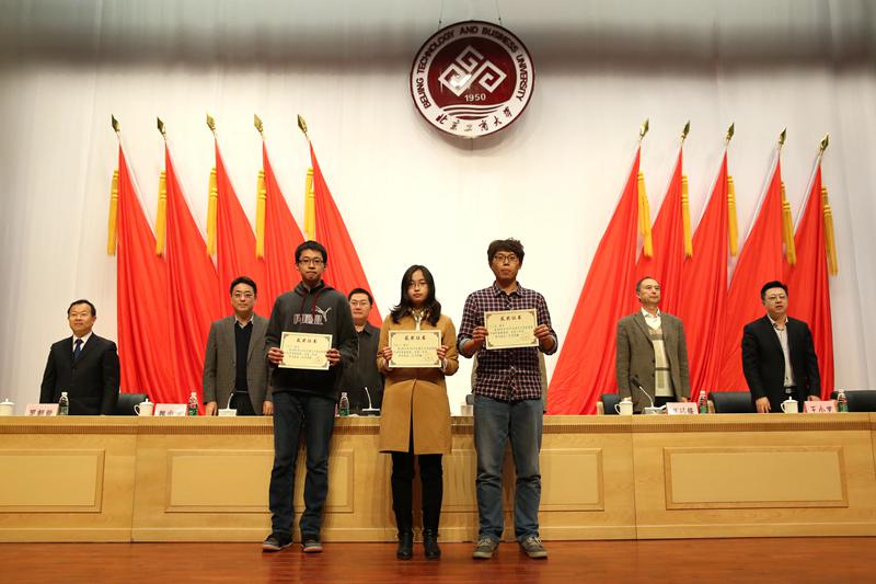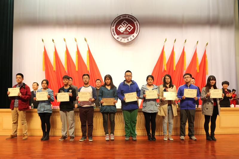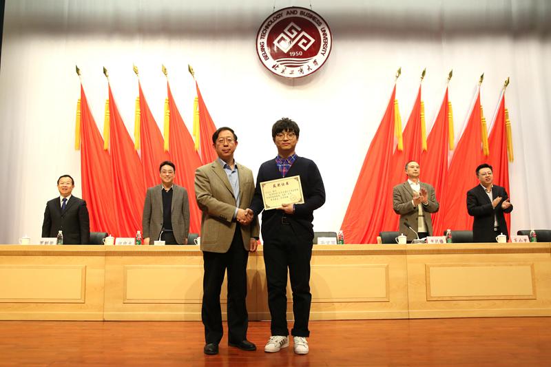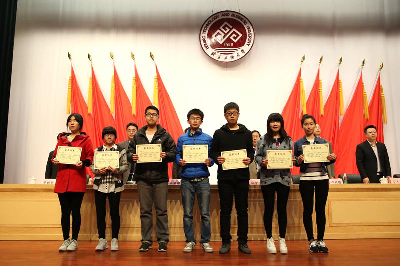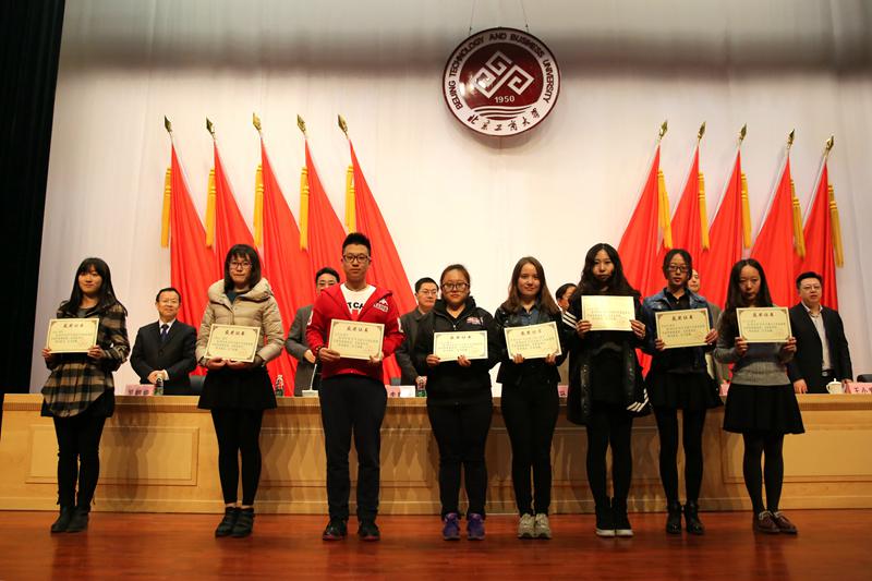 李朝鲜副校长宣读了《北京工商大学关于表彰2014年12月份全国大学英语四六级考试成绩优异学生的决定》,校长孙宝国、党委副书记卢思锋、副校长李朝鲜、学校办公室主任王小艺、教务处处长魏中龙、学生处处长吕素香、外国语学院院长罗朝能为我校参加2014年12月全国大学大学英语四、六级考试获得英语四级优秀奖、六级优秀奖、四级三等奖、四级二等奖及四级一等奖的31名学生颁发获奖证书并合影留念。会上,获奖学生代表经济学院吴彤同学上台发言,与在座同学分享了她的英语学习经验和心得体会。