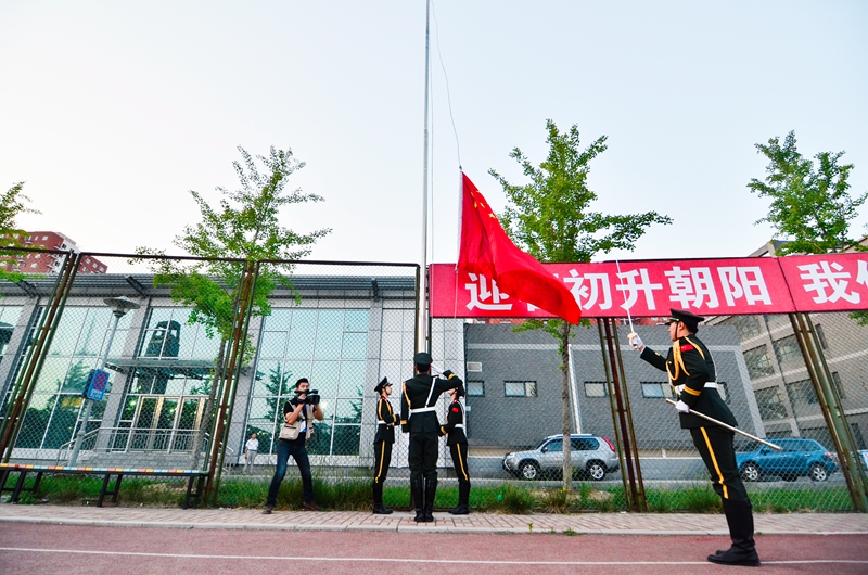 国旗手步伐整齐,英姿飒爽;全场人员共唱激昂的国歌,国旗缓缓升起。