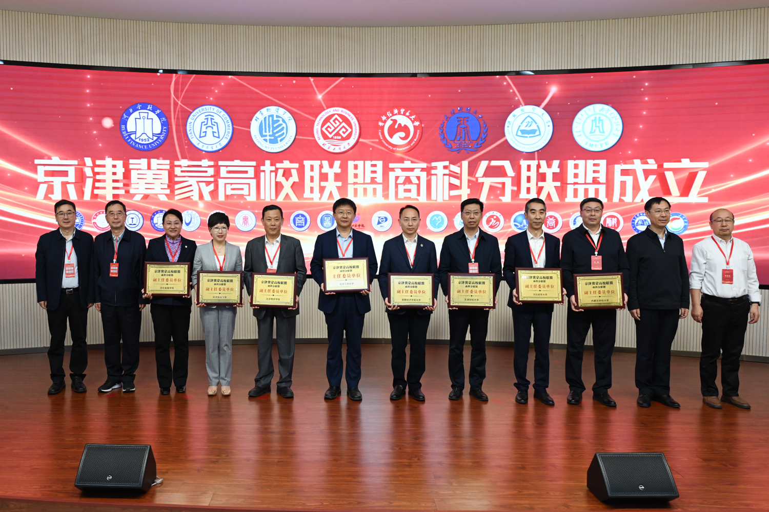 商科分联盟成立仪式上,商科分联盟主任委员单位北京工商大学、7家副主任委员单位领导上台共同启动京津冀蒙高校联盟商科分联盟。与会京津冀蒙四地教育主管部门领导为各委员单位授牌。