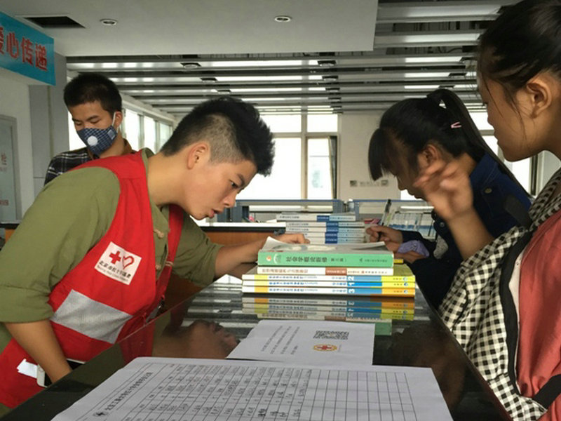 9月10日,新生开课前,我校资助中心和校红十字会在“爱心书屋”为家庭经济困难学生免费发放教材,本次活动共为143名学生发放教材834本。