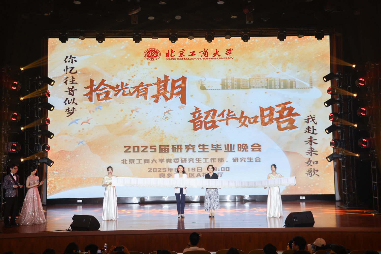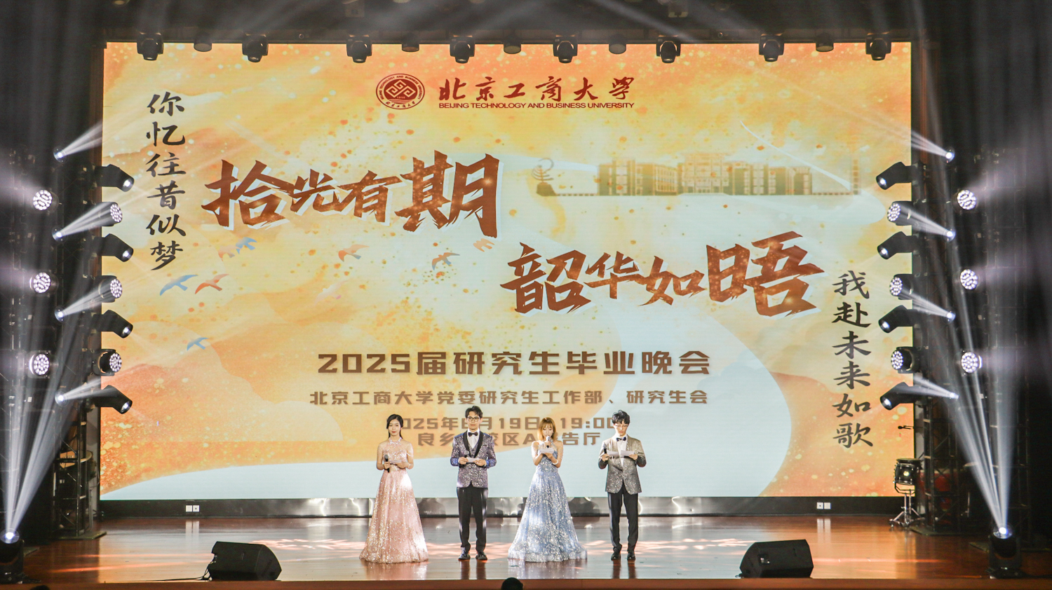 6月19日晚,学校在良乡校区举行“拾光有期·韶华如晤”2025届研究生毕业晚会。学校党委副书记李中奇、校友会办公室主任张春萍、党委研究生工作部部长郭新愿、马克思主义学院党总支书记任金晶、党委研究生工作部副部长兼研究生院副院长张倩、研究生院副院长申现宝、保卫处副处长卢灿宽、公共事务处副处长马腾、商学院党委副书记张悦、数学与统计学院党委副书记毕平平、校民乐团指导教师刘兆以及各学院辅导员、研究生代表等600余人共同观看晚会。