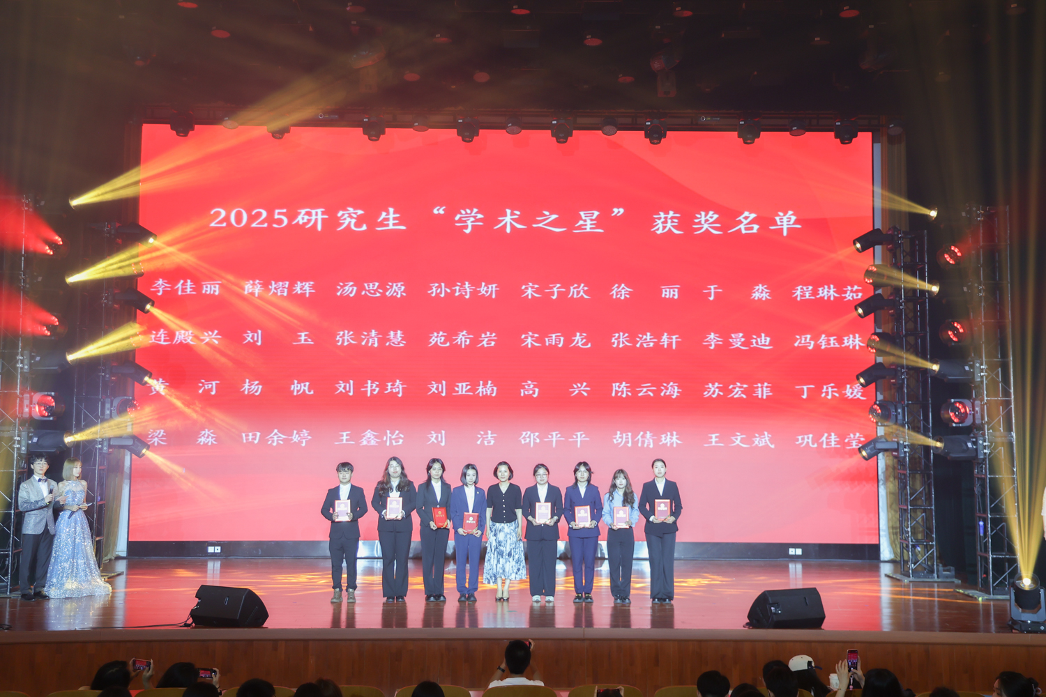 第二篇章“韶华共渡”邀请了2020—2024届研究生会主席团成员以朗诵的形式追忆校园生活、表达美好祝愿,让观众又惊喜又感动;歌曲联唱中三首脍炙人口的歌曲引发全场大合唱;舞蹈《Breathe in》充满青春正能量;并对研究生“学术之星”进行颁奖表彰。