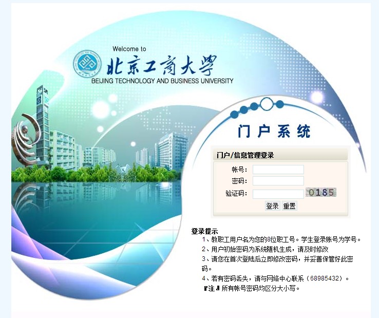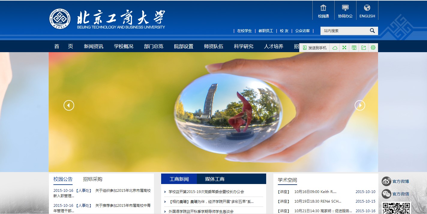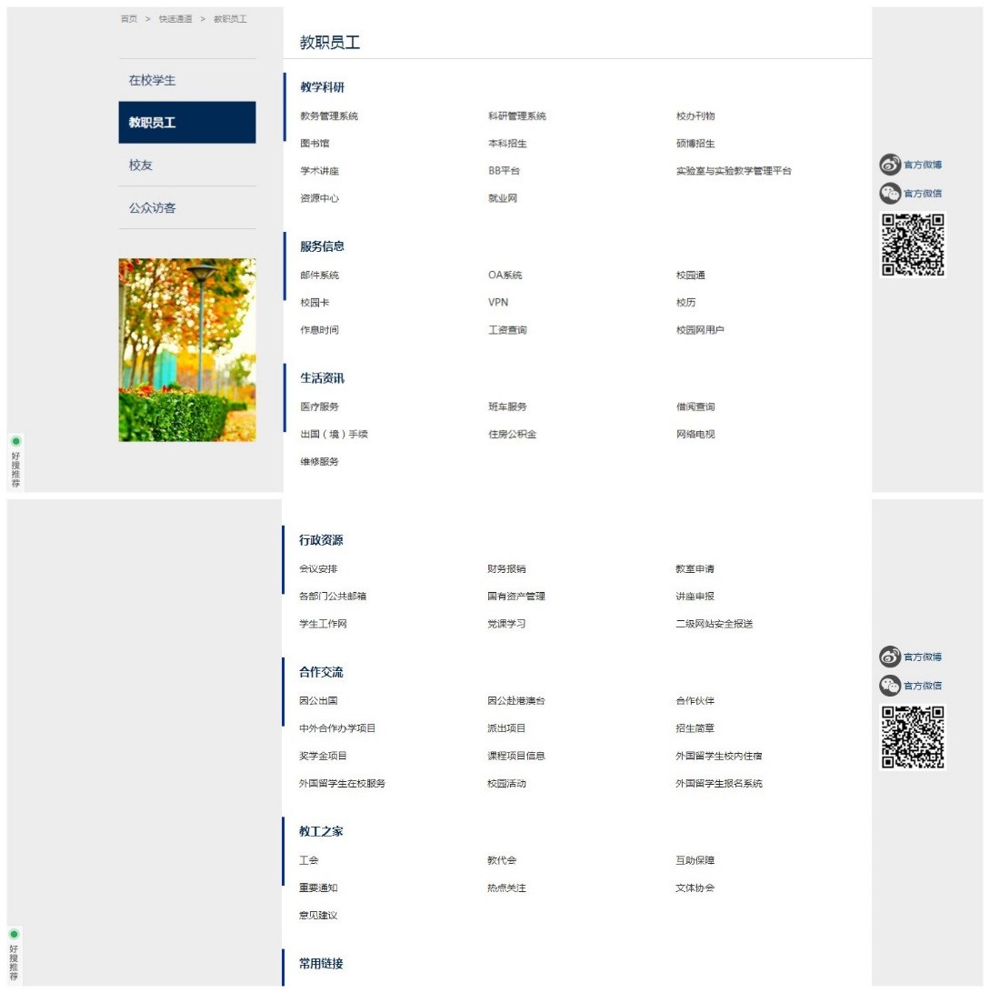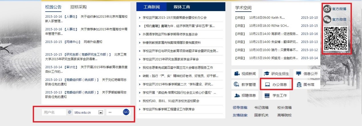 页面右侧有我校官方微博链接及官方微信二维码,通过点击、扫描可直达。页面底端保留了学校邮箱入口,方便登陆。