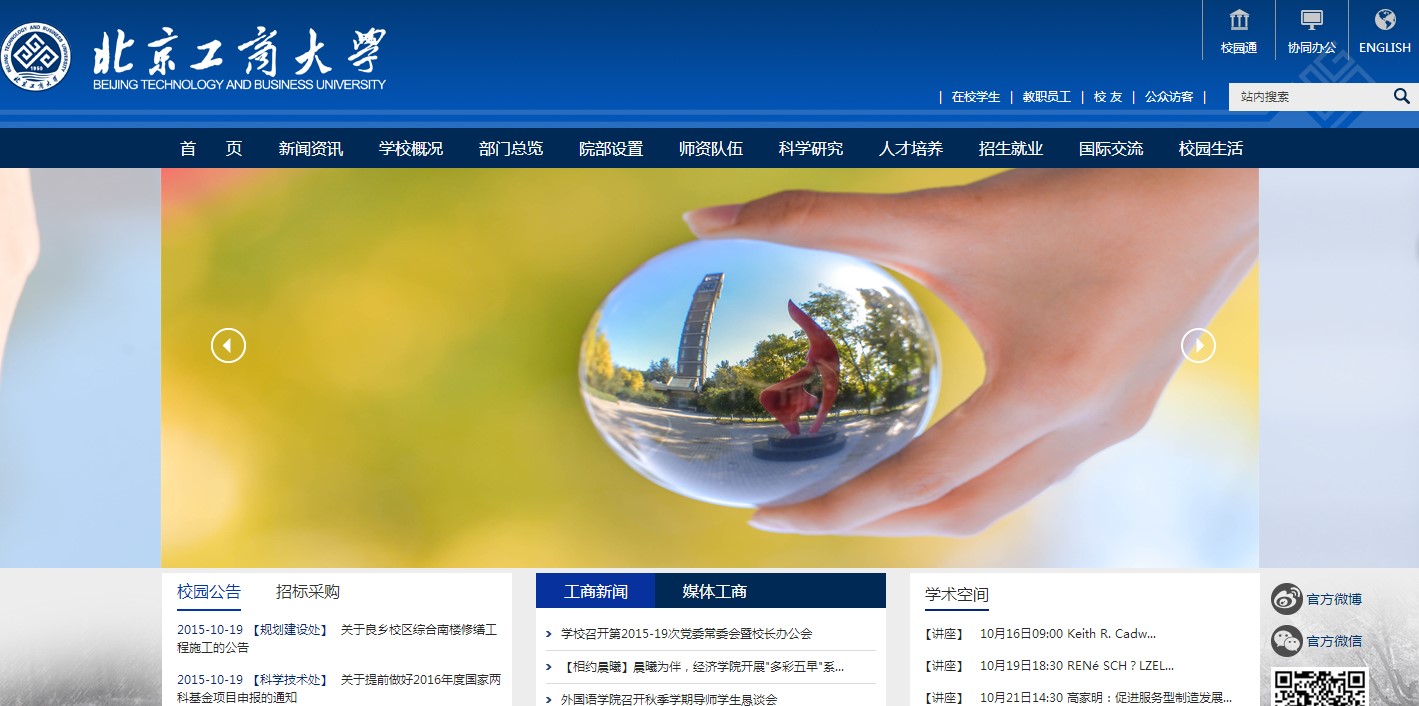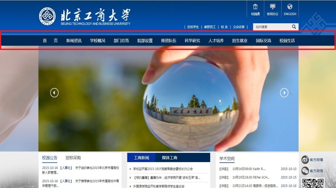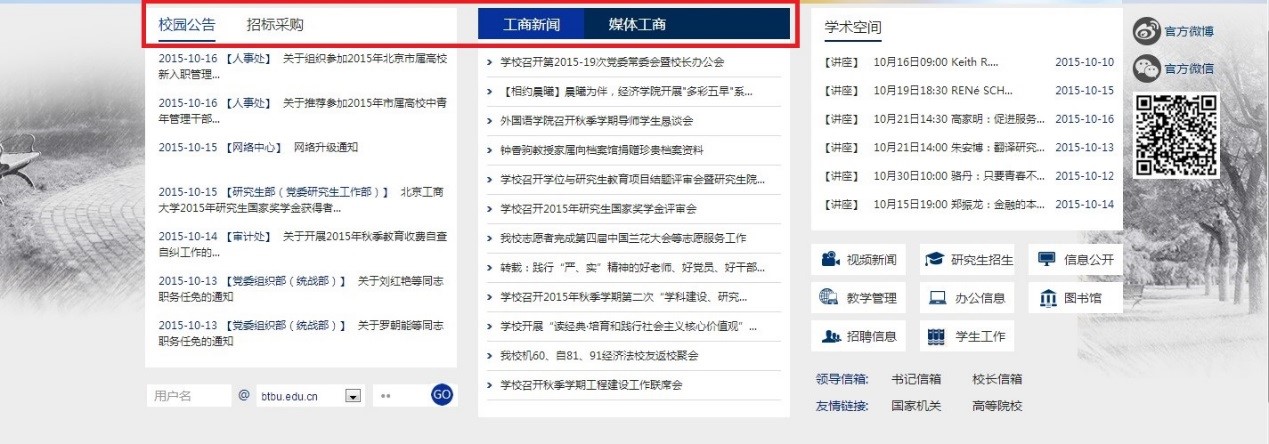为节约空间、增加内容,新版校园网设计同区域多选项展示,利用选项卡,用户可通过选择工商新闻、媒体工商,校园公告、招聘采购,将鼠标放置内容栏目条,栏目内将显示相应内容。此外,用户如果想浏览某栏目的更多内容,点击相应栏目条即可,如光标点击“校园公告” 上可以展示前20条公告及后续内容。