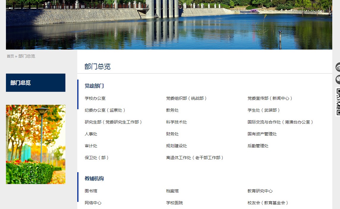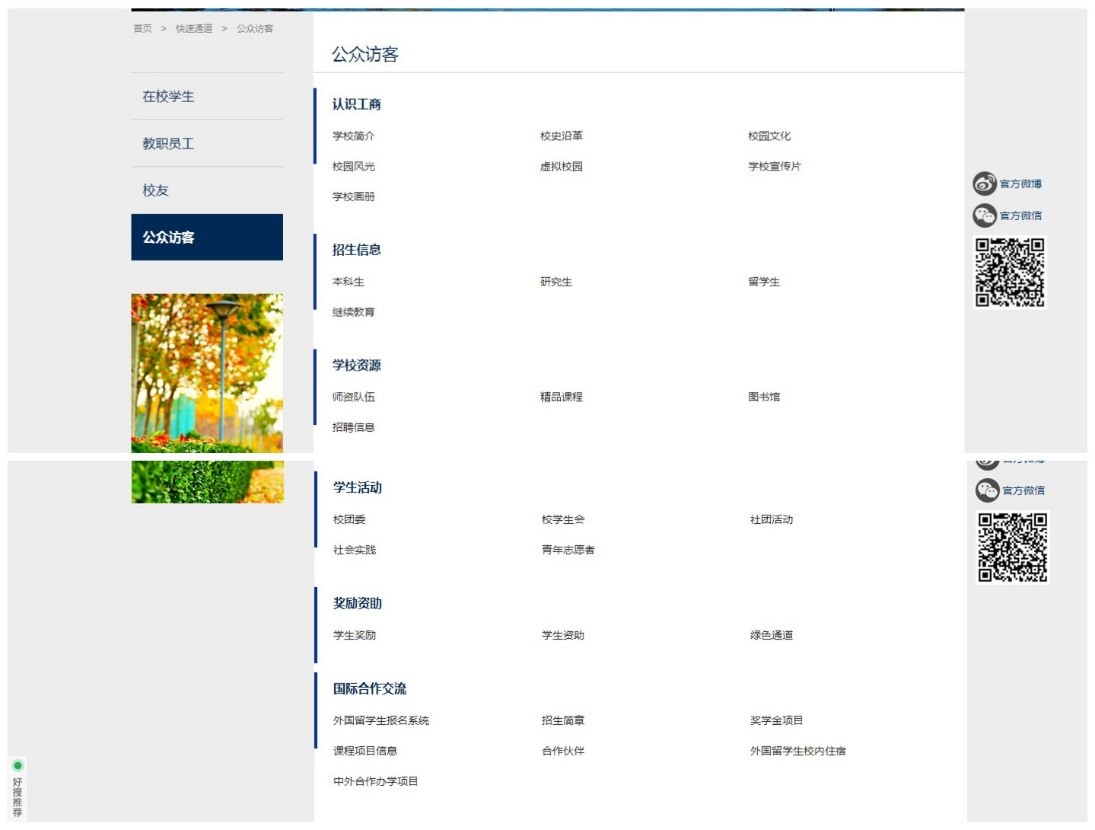 此外,在更新各二级页面内容的同时,在页面左侧下方增加学校风景图片,采用图文并茂的形式构建各网站板块。
