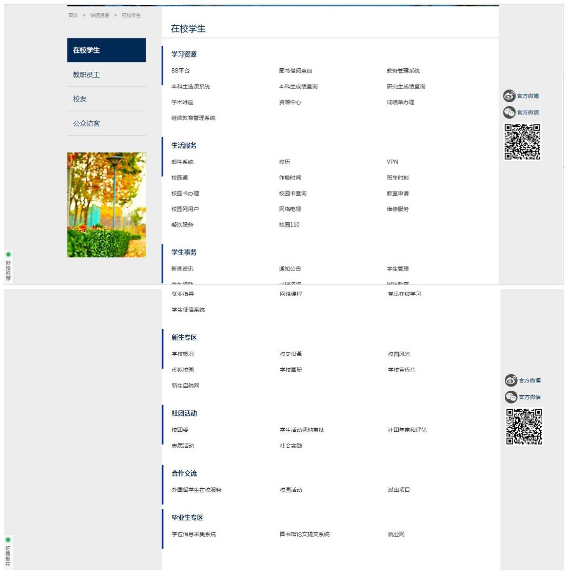 在校学生入口,包含学习资源、生活服务、学生事务、新生专区、社团活动、合作交流、毕业生专区七大内容板块。学生可通过此网站直接进入BB平台、教务系统、新生导航网等,直接查询通知公告、学校餐饮等服务信息,了解志愿活动、社会实践及国际交流项目等,方便快捷。