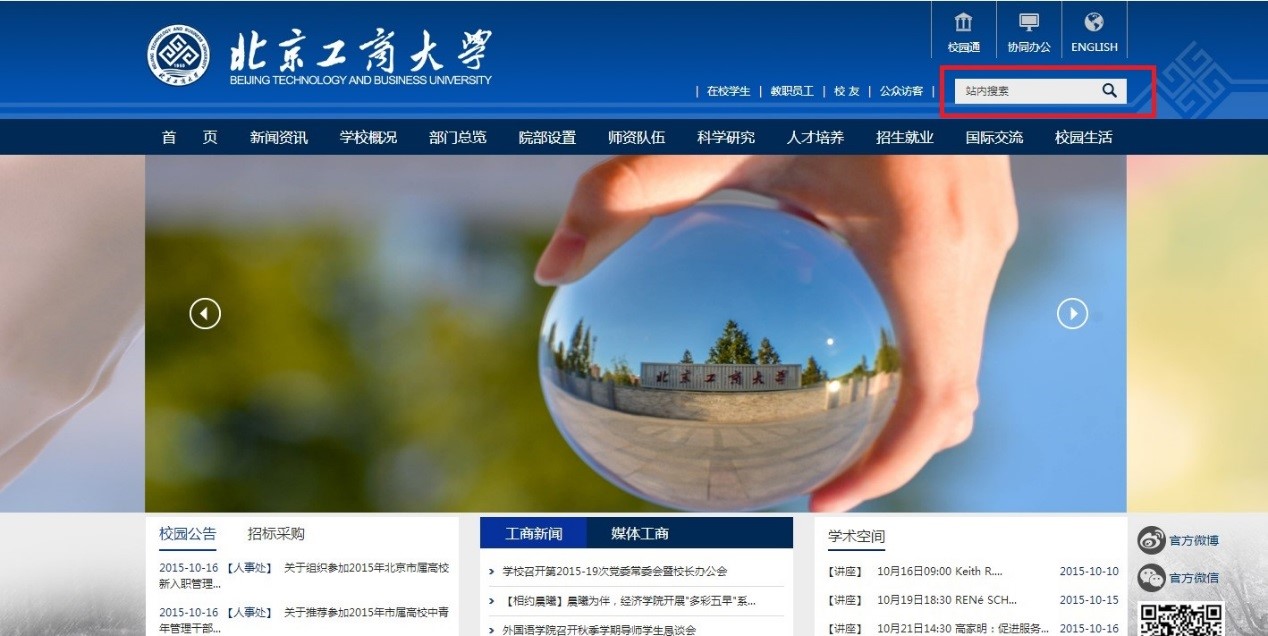 网页右上角设有站内搜索,可直接搜索校园网内信息。