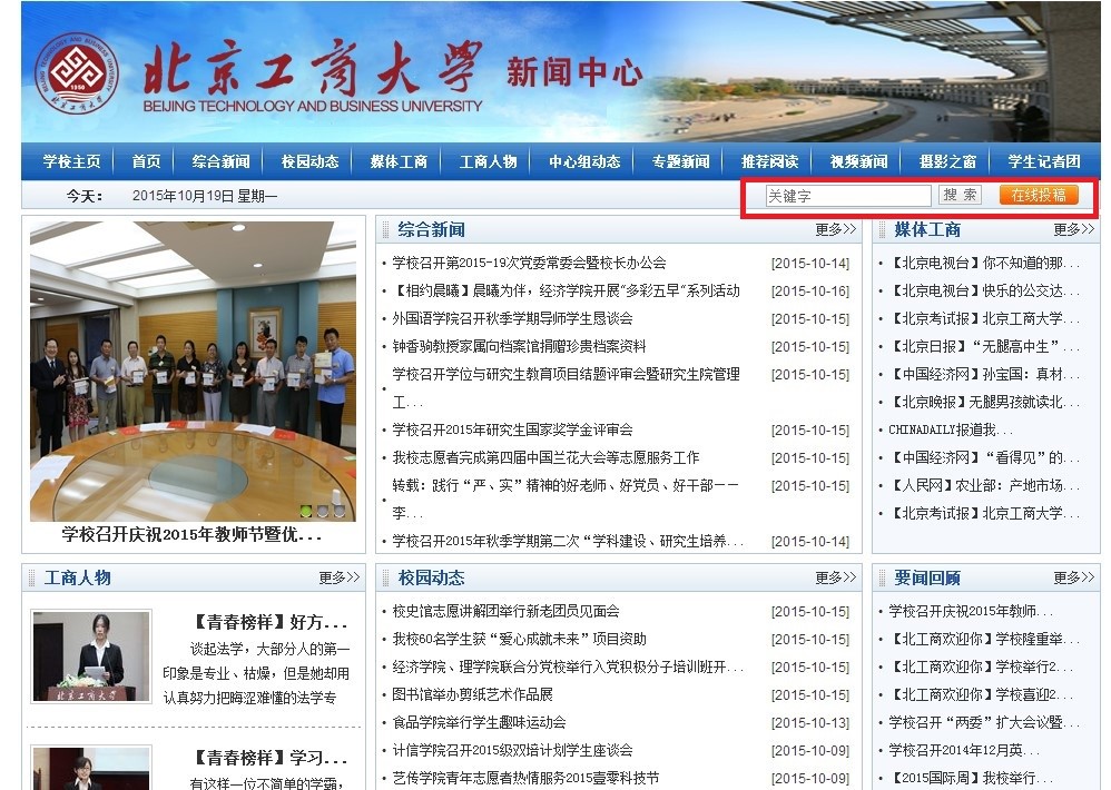 为提高用户的使用美观度,新闻网主页进行了美化,大通栏照片以优美的校园景观、师生形象、特色新闻图片等作为页面主图。除通栏图片外,还将滚动图片作为铺底,呈现在页面两侧,新式新颖,这种形式在高校网页设计中较为少见。