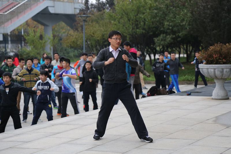 行政楼前,活泼的音乐响起,材机学院的学生们跟着音乐舒展四肢,台阶上,辅导员郑光小臂抬高、膝盖微弯,正在充当着领操员的角色。“因为刚开始我们都不太熟悉广播操的动作,郑老师主动在前排带领我们一起做,一步一步的慢慢教,非常有耐心。”机械154的同学说。