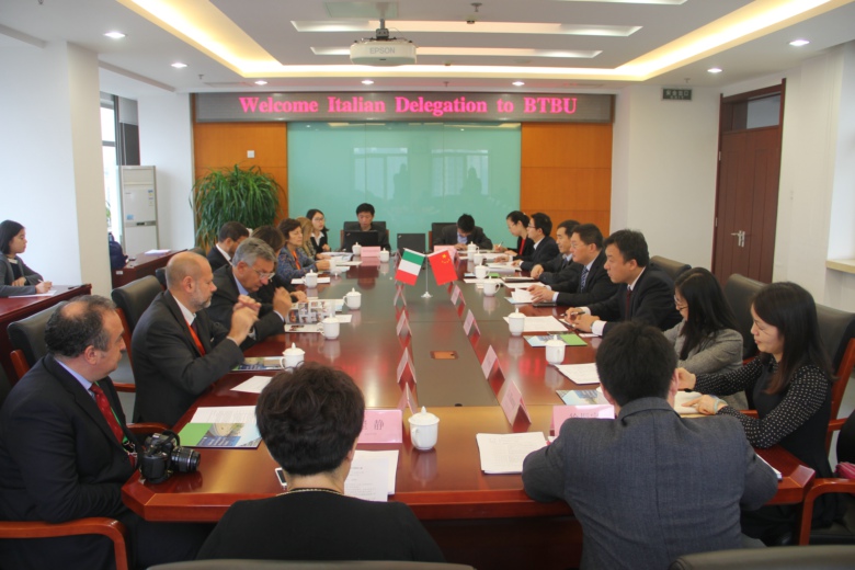 李朝鲜副校长首先代表孙宝国校长对代表团一行来我校访问表示欢迎。他向代表团成员介绍了我校的校情校史、专业设置、学科特色以及国际化发展的相关情况,并希望通过代表团的此次访问,我校与意大利的相关高校建立起合作关系,在双方的优势学科和专业开展深入的合作和交流。