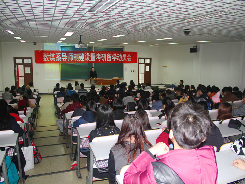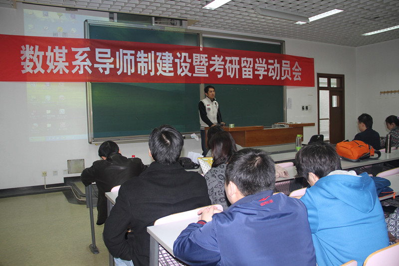 11月18日,艺术与传媒学院在良乡校区召开了数字媒体艺术系导师制建设暨考研留学动员会。艺传学院党委书记林刚、副院长郑子云、数字媒体艺术系的全体教师以及数字媒体艺术专业13级、14级、15级的全体学生参加了会议。会议由数字媒体艺术系系主任孙进主持。本次会议旨在提升学生学习英语热情,营造良好的考研和出国留学氛围;同时结合学院的特色机制“导师制”,进一步深化本科教学综合改革,建立良好的教师与学生的互动机制。